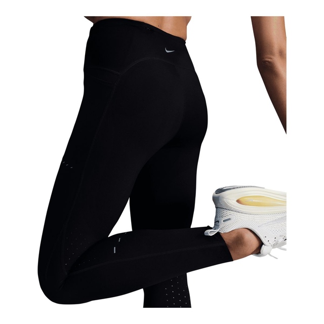 The Nike Women's Dri-FIT Swift High Rise 7/8 Tights are designed using insights from runners to optimize functionality for your miles. Featuring Nike's signature Dri-FIT technology, these sweat-wicking tights move moisture away from your skin to keep you dry and comfortable. Perforations behind the knees and seamless inner legs enhance breathability while reducing chafing. Multiple pockets, including drop-in side pockets and a zippered waistband pocket, provide convenient storage for your essentials during runs. Reflective details enhance visibility in low light conditions.