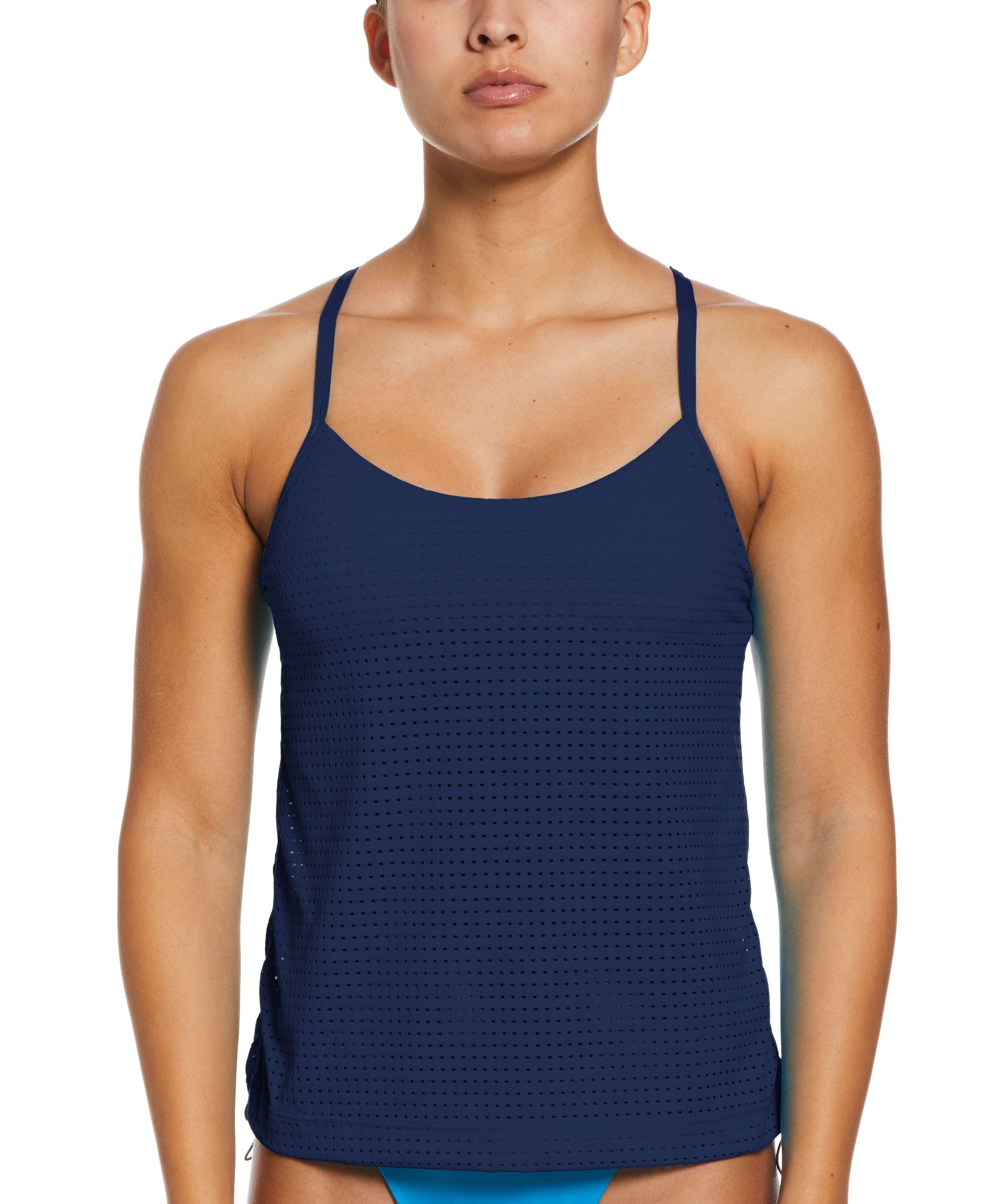 Swim in confidence with Nike Women's Essential Layered Tankini. Designed for medium bust support, it features a flattering layered fit with adjustable drawcords, removable soft cups in stabilizer pockets to ensure lasting comfort and a full lining for modesty. The classic Nike swoosh at the back of the Nike tankini adds a touch of style.