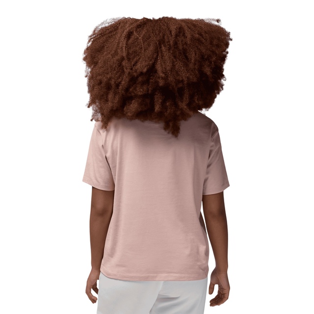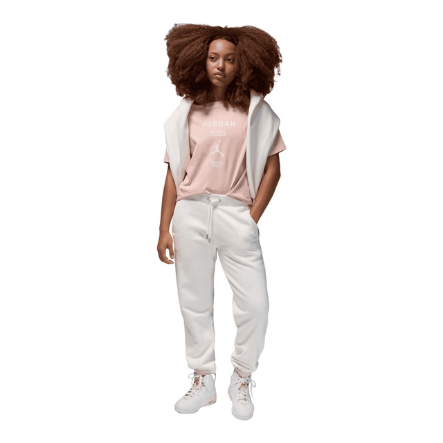 The Nike Women's Jordan Graphic T Shirt is a premium athletic tee designed for superior comfort and performance. Crafted with Nike's innovative Dri-FIT technology, this lightweight top wicks away moisture to keep you cool and dry during intense workouts or casual wear. The soft, sweat-wicking fabric and relaxed fit allow unrestricted movement, while a hidden zippered pocket securely stores essentials like your phone or keys. Featuring stylish Jordan graphics, this versatile tee can effortlessly transition from the gym to running errands.