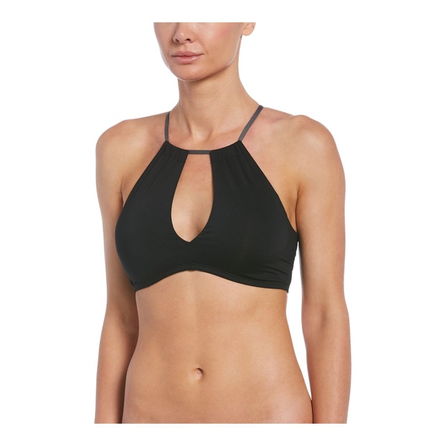This Nike bikini top combines performance and style. The soft, removable cups provide light support and coverage for low-impact water activities. Adjustable lace-up detail at the front allows you to customize the fit for a flattering silhouette. Stabilizer pockets keep cups securely in place, while the high neckline offers a modest, trendy look. At least 75% recycled polyester fabric makes this a sustainable swimwear choice. Slip into this unique Nike bikini top for customizable coverage and eco-friendly style.
