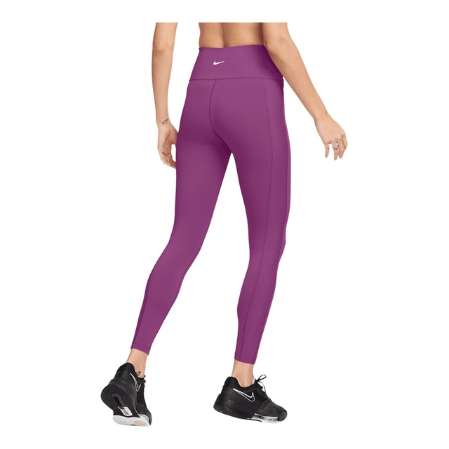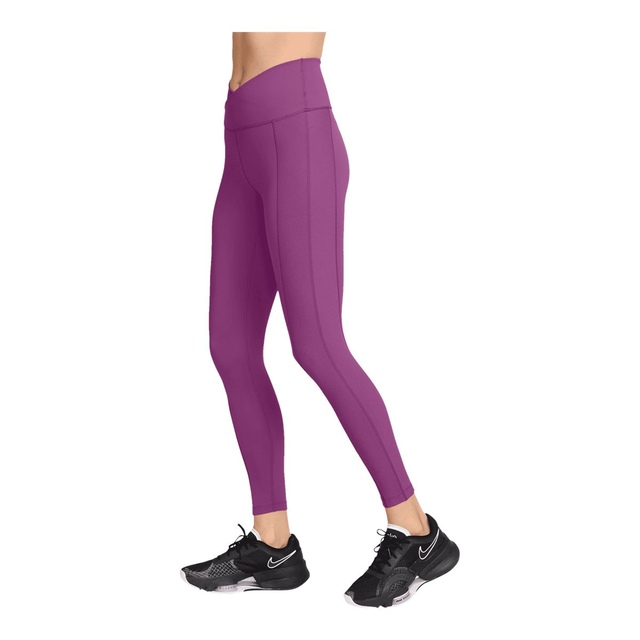 The Nike Women's One High Rise Rib Wrap 7/8 Pocket Tights combine style and performance for any activity. Crafted with Nike's Dri-FIT technology, these tights wick away moisture to keep you dry and comfortable. The wrapped waistband and ribbed side panels provide a flattering, dimensional fit, while the high-rise waist ensures full coverage.