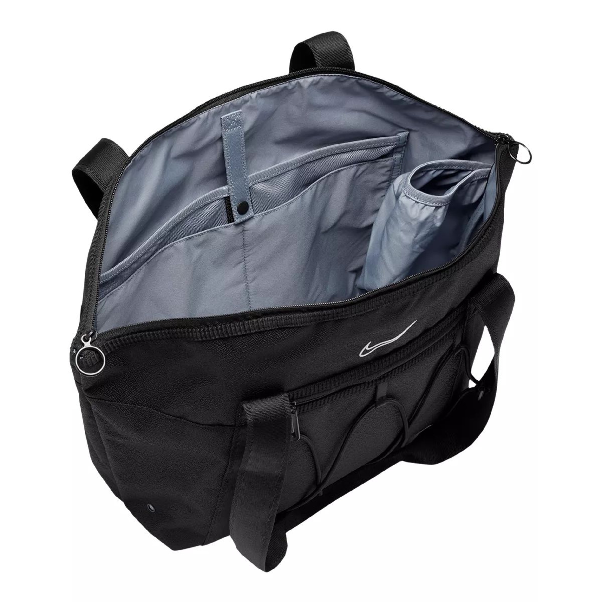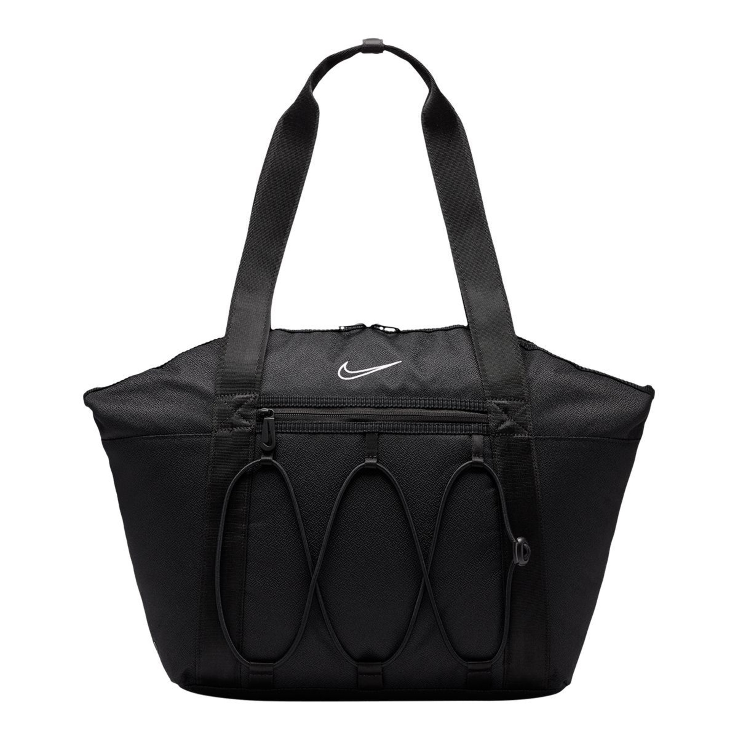 The Nike Women's One Tote Bag supports seamless organization with a wide-zippered main compartment, a padded laptop sleeve and various internal and external pockets. Elastic bungee and durable snap-together handles increase functionality, while metallic Swoosh zipper pulls add a unique brand touch. This Nike tote bag is ideal for daily use with its durable spot-clean finish.