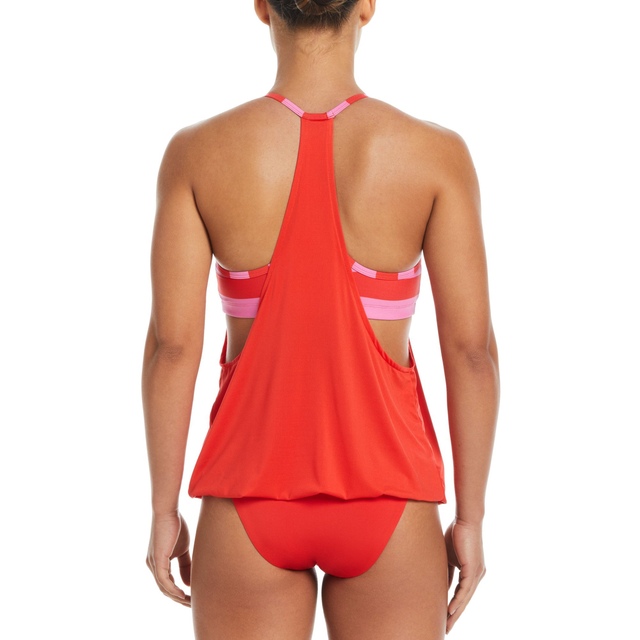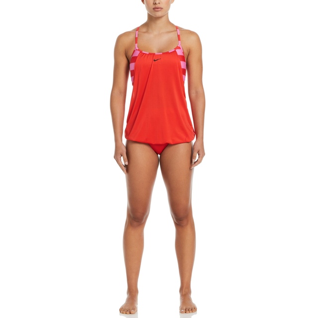This Nike tankini provides medium bust support and layered coverage perfect for active days in the water. The loose fit tank layered over fitted bottoms provides a stylish look while removable soft cups ensure comfort and coverage. Stabilizer pockets keep cups securely in place. With a heat transfer Swoosh and lined bottoms for added modesty, this tankini allows you to move freely while keeping your look sporty and chic.