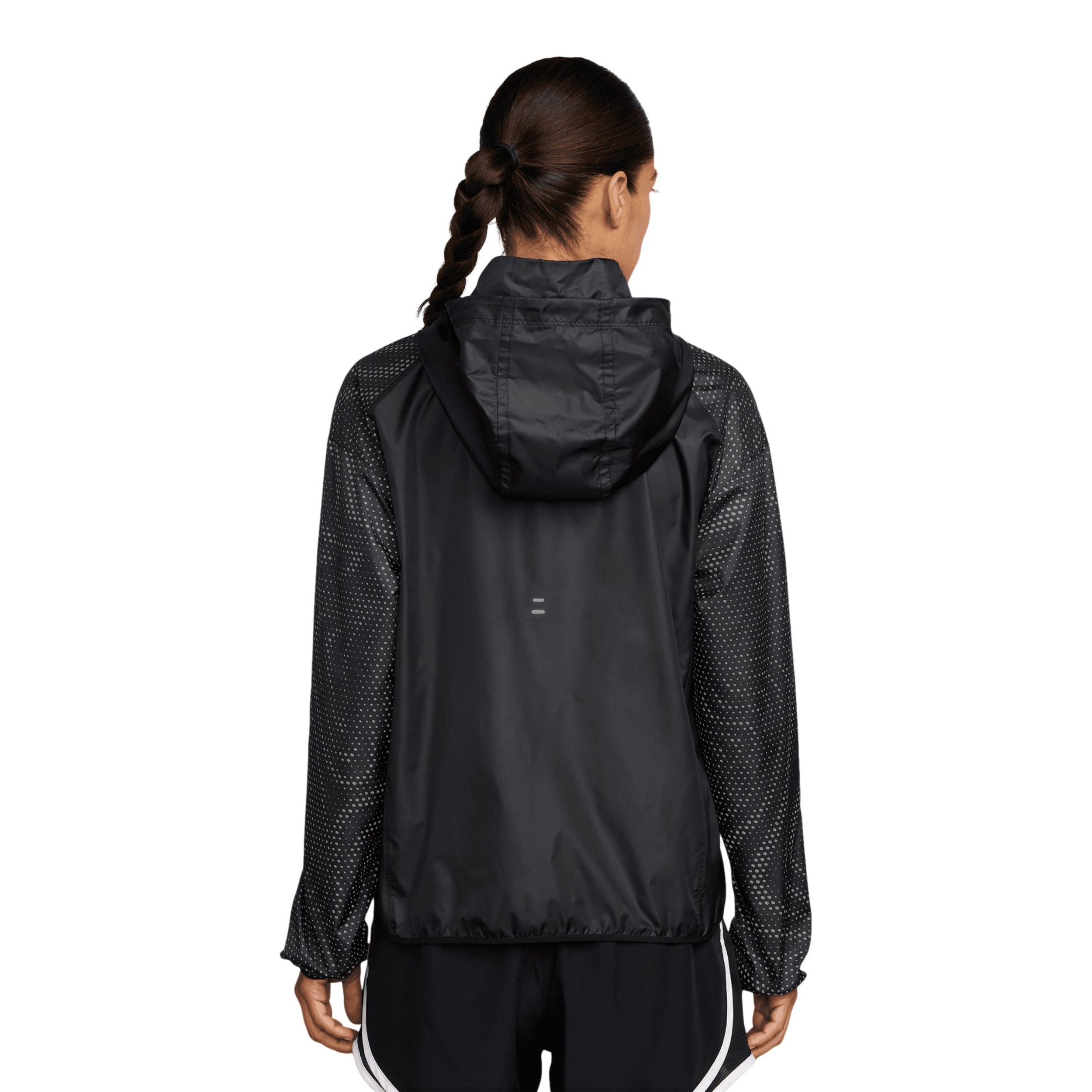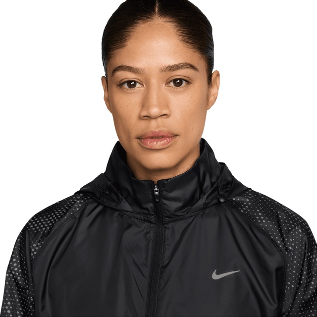 Stay visible and dry during your evening runs with the Nike Women's Tempo Repel Jacket. This lightweight jacket features a dynamic reflective print and a water-repellent finish, ensuring you can keep your rhythm even in wet conditions. Designed for comfort, it offers a loose fit for easy layering.