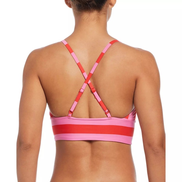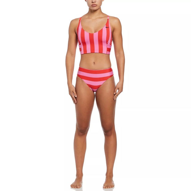 This Nike midkini combines style and performance for an active day at the beach or pool. The recycled fabric offers a sustainable design while medium bust support provides stability during swimming and water sports. Adjustable straps allow a customizable fit, and removable soft cups deliver coverage and comfort. Stabilizer pockets keep cups securely in place, and a V-neck cut with bold stripes creates a flattering, athletic look. With its mix of function and flair, this Nike tankini empowers women to move freely and focus on fun.