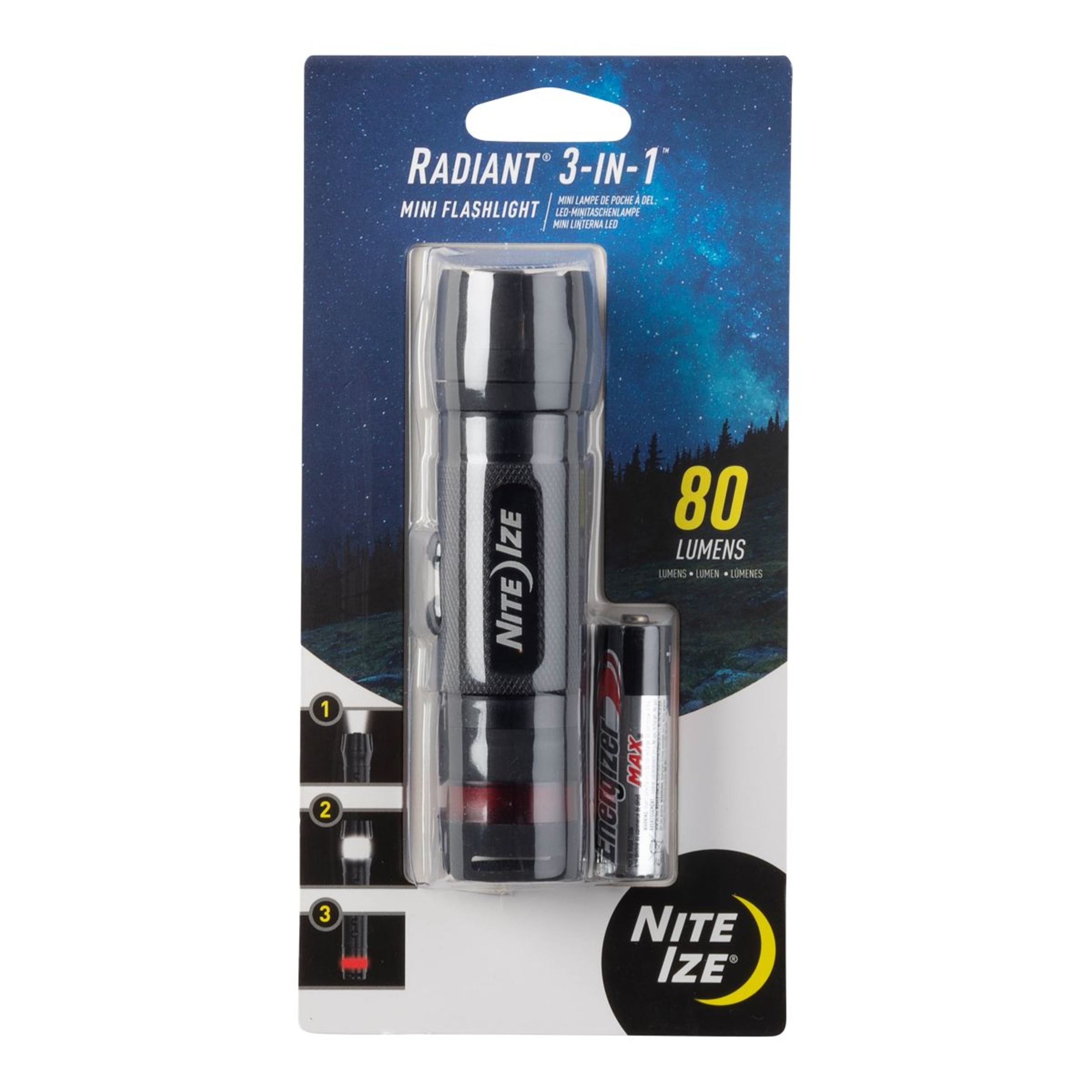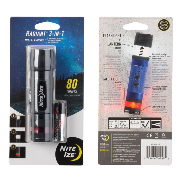 The Nite Ize Radiant 3-in-1 Mini Flashlight combines a flashlight, lantern, and safety light in one compact device. It features an 80-lumen LED with high and low modes for focused illumination. The convertible design transforms into a lantern with a sliding motion, offering ambient lighting. A built-in red safety light provides glow, flash, and SOS modes for enhanced visibility. The flashlight includes a battery-saving lockout mode to extend its operational life. Versatile and efficient, this Nite Ize mini flashlight adapts to various lighting needs, from focused beams to widespread illumination, making it a practical tool for outdoor enthusiasts.