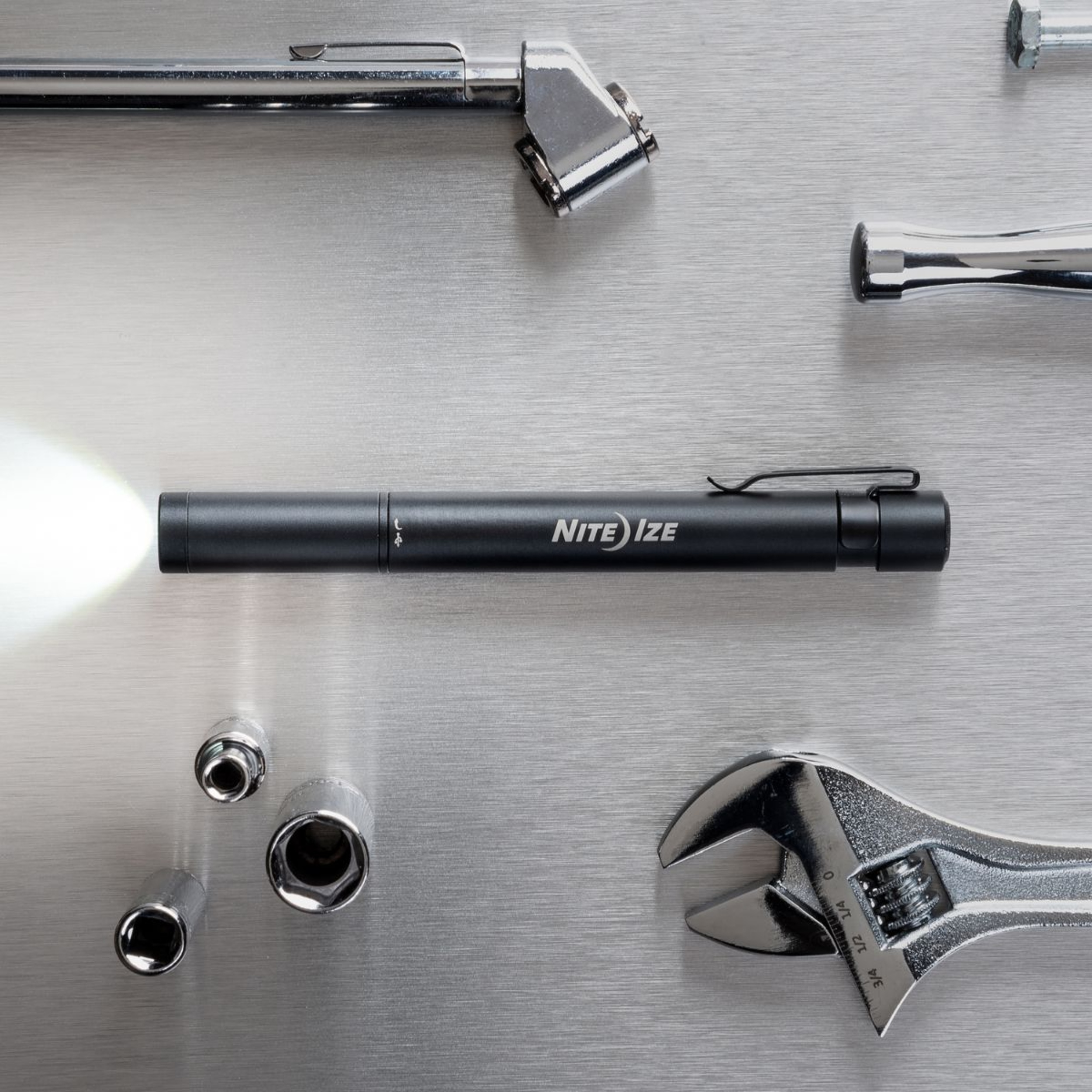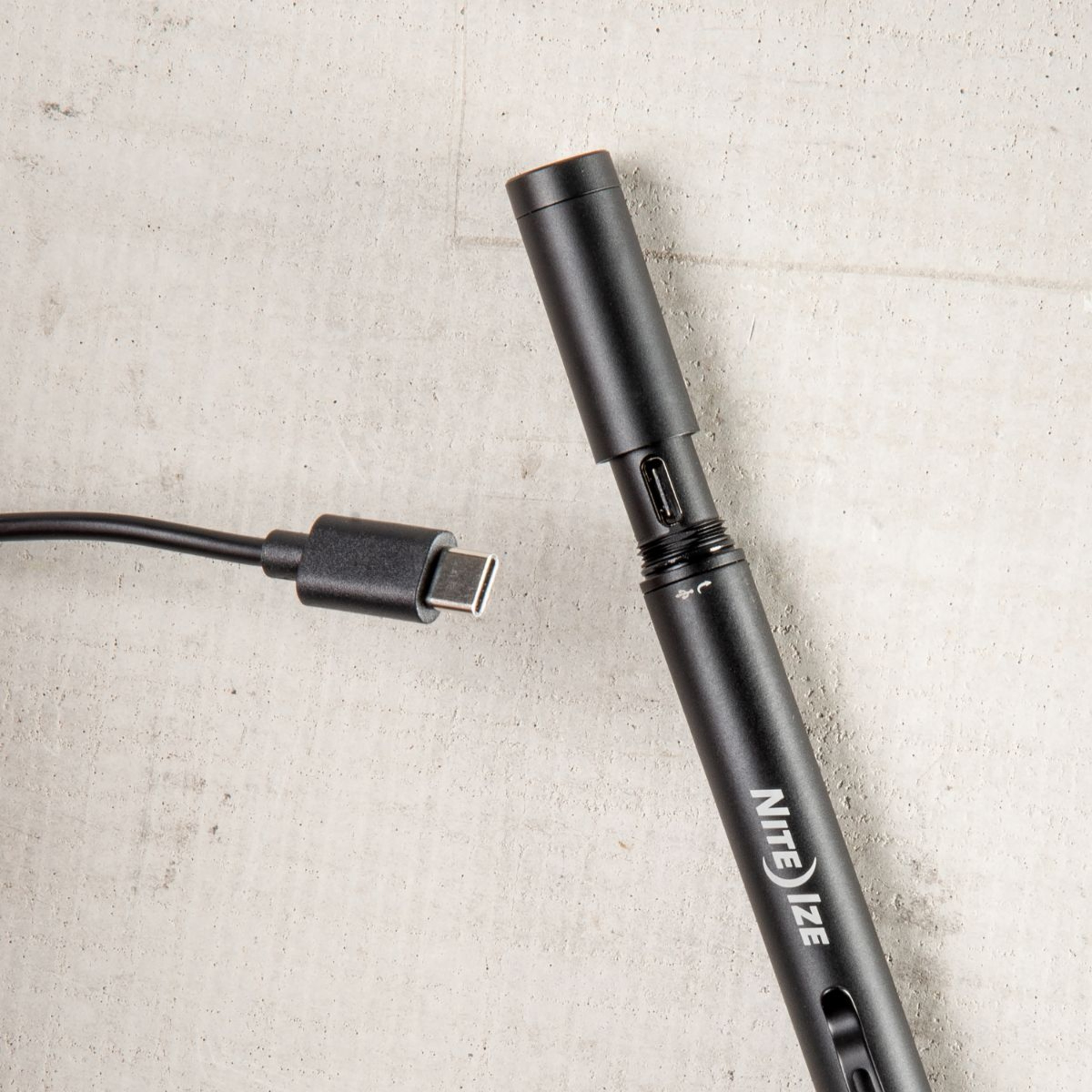 The Nite Ize Radiant Rechargeable Pen Light is a solid and easy-to-carry light that fits in the smallest spaces. This versatile LED pen light features three brightness modes - a brilliant 235-lumen high mode, an 11-lumen low mode, and a power-saving lockout mode. It is made of robust aluminum with a smooth black finish that looks elegant, and is waterproof up to 1 meter and impact resistant to survive drops from the same height. The integrated stainless steel clip and push-button endcap allow you to use it conveniently with just one hand. It charges quickly with a USB-C port, taking only 1.5 hours to work again.