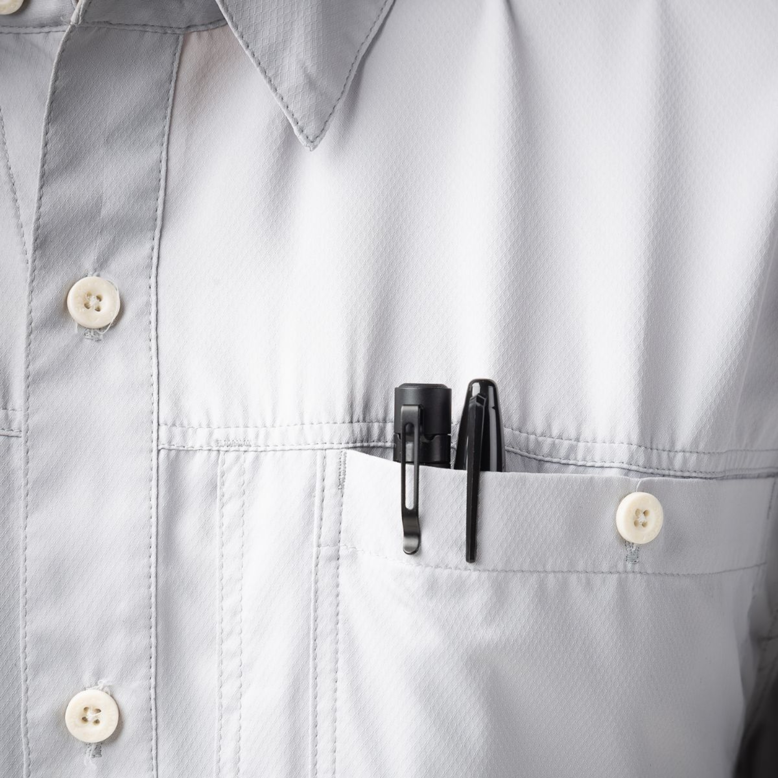 Simple one-handed stainless steel pocket clip with a push-button switch for easy brightness control