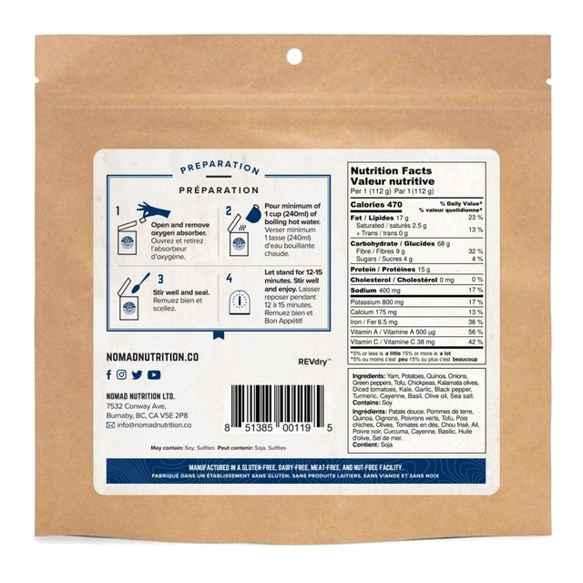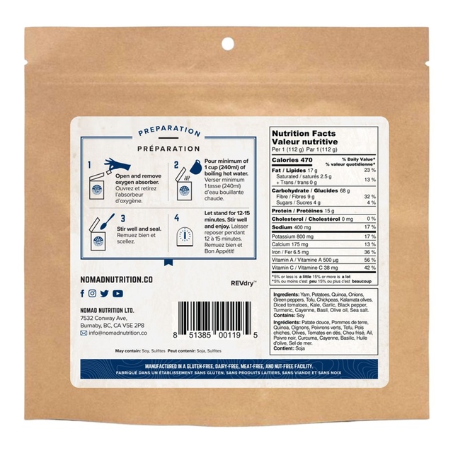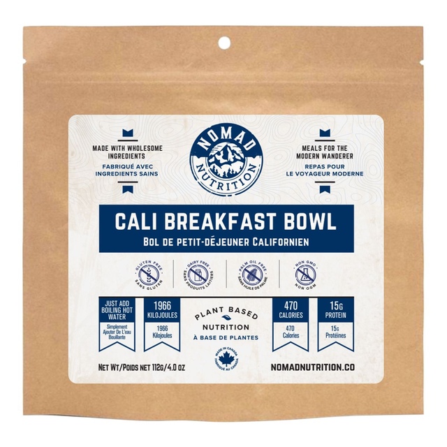 Start your day right with this Nomad Cali Breakfast Bowl. This vegan-friendly, high-energy meal is made from all-natural ingredients and is gluten-, dairy- and peanut-free, so everyone can enjoy. Ideal for easy prep in your outdoor camp, simply add hot water to this Nomad breakfast bowl to create a nutritious breakfast in minutes.