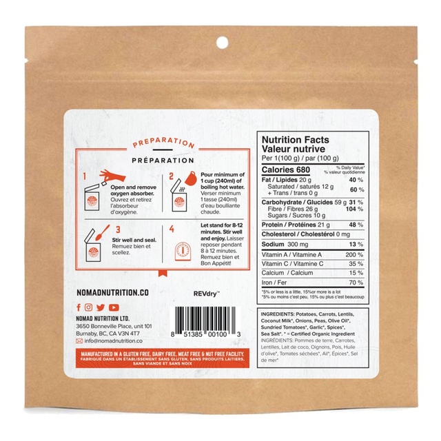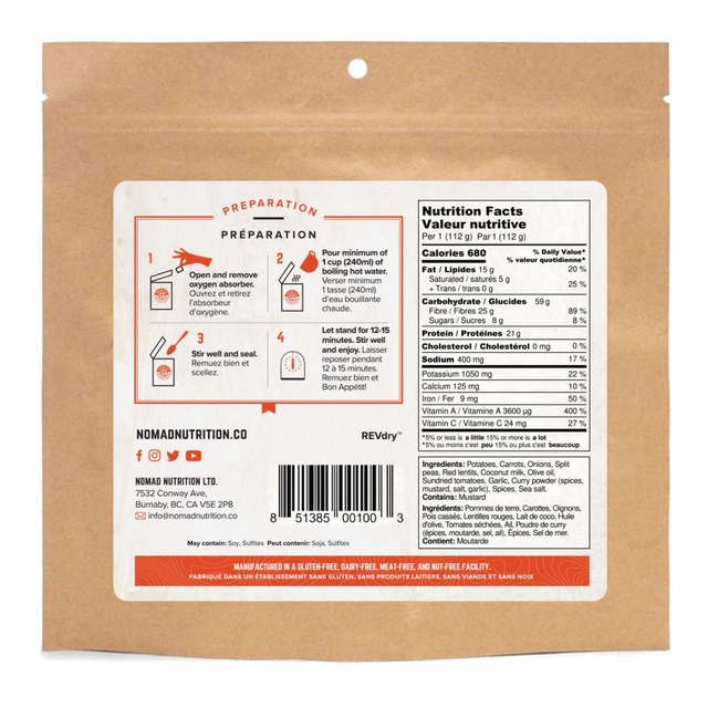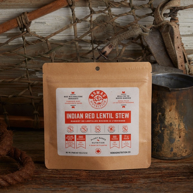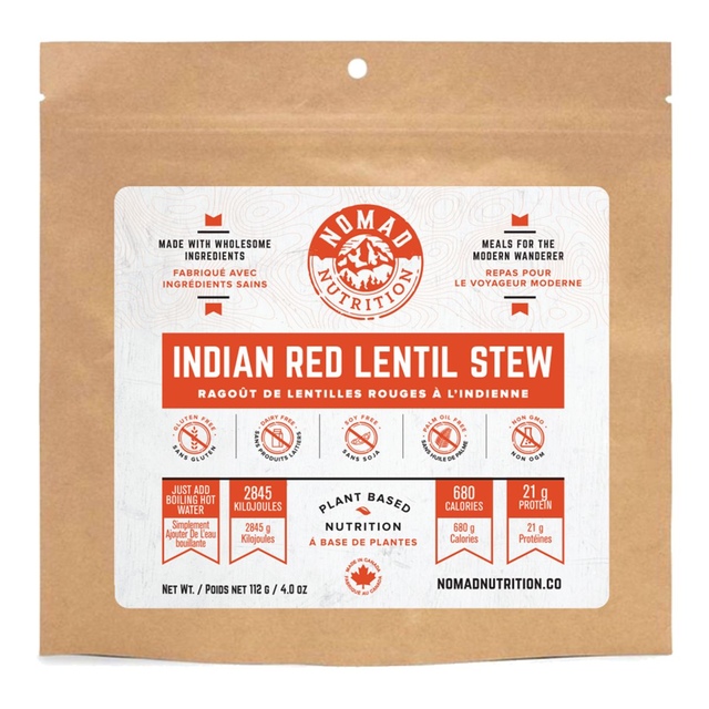 The Nomad Nutrition Dehydrated Indian Red Lentil Stew is a delicious, high-energy meal crafted with all-natural, pronounceable ingredients. This vegan-friendly, gluten-free, dairy-free and peanut-free option requires only hot water and is easy to prepare in minutes. Like all Nomad Nutrition meals, this stew is perfect for quick, nutritious dining — without preservatives or GMOs.