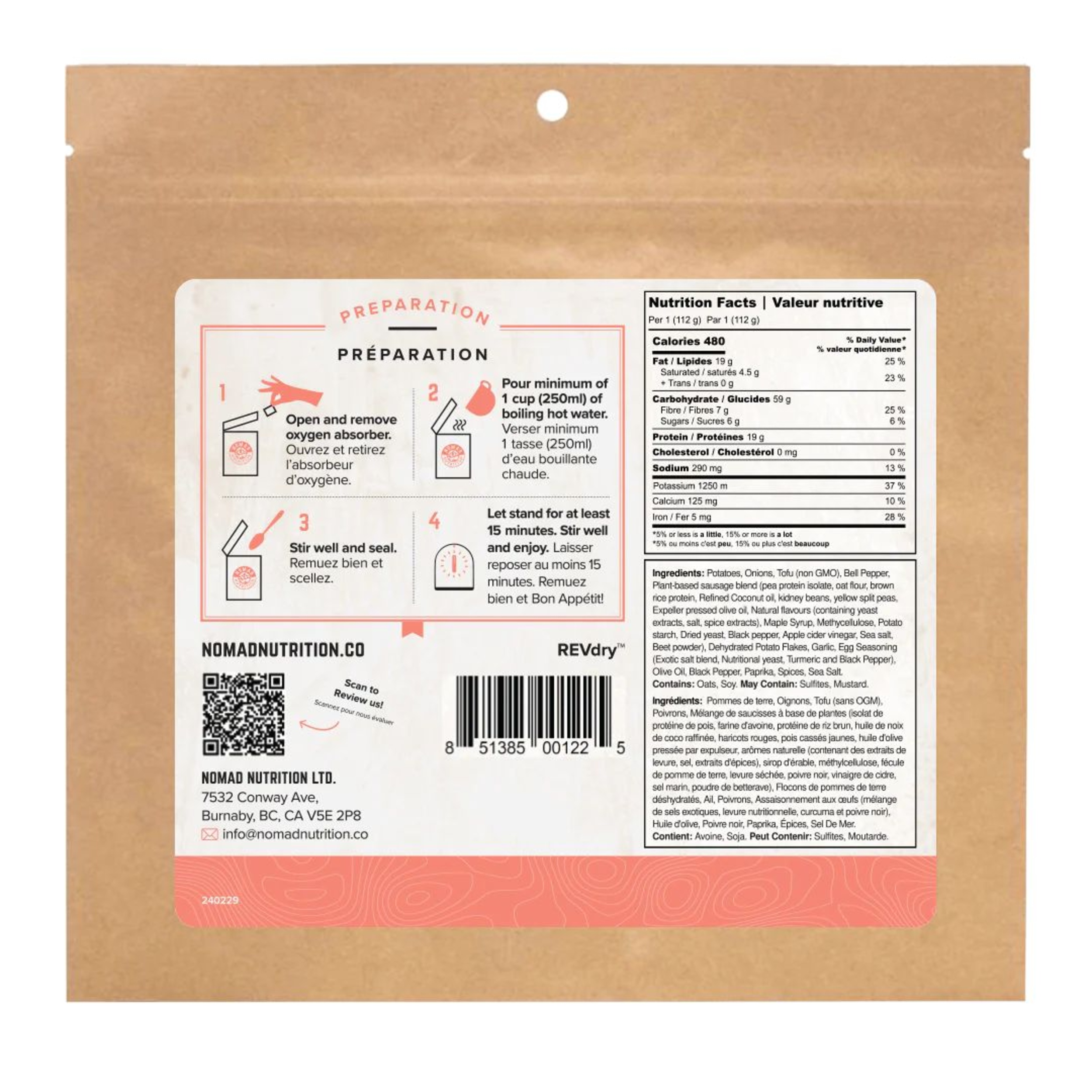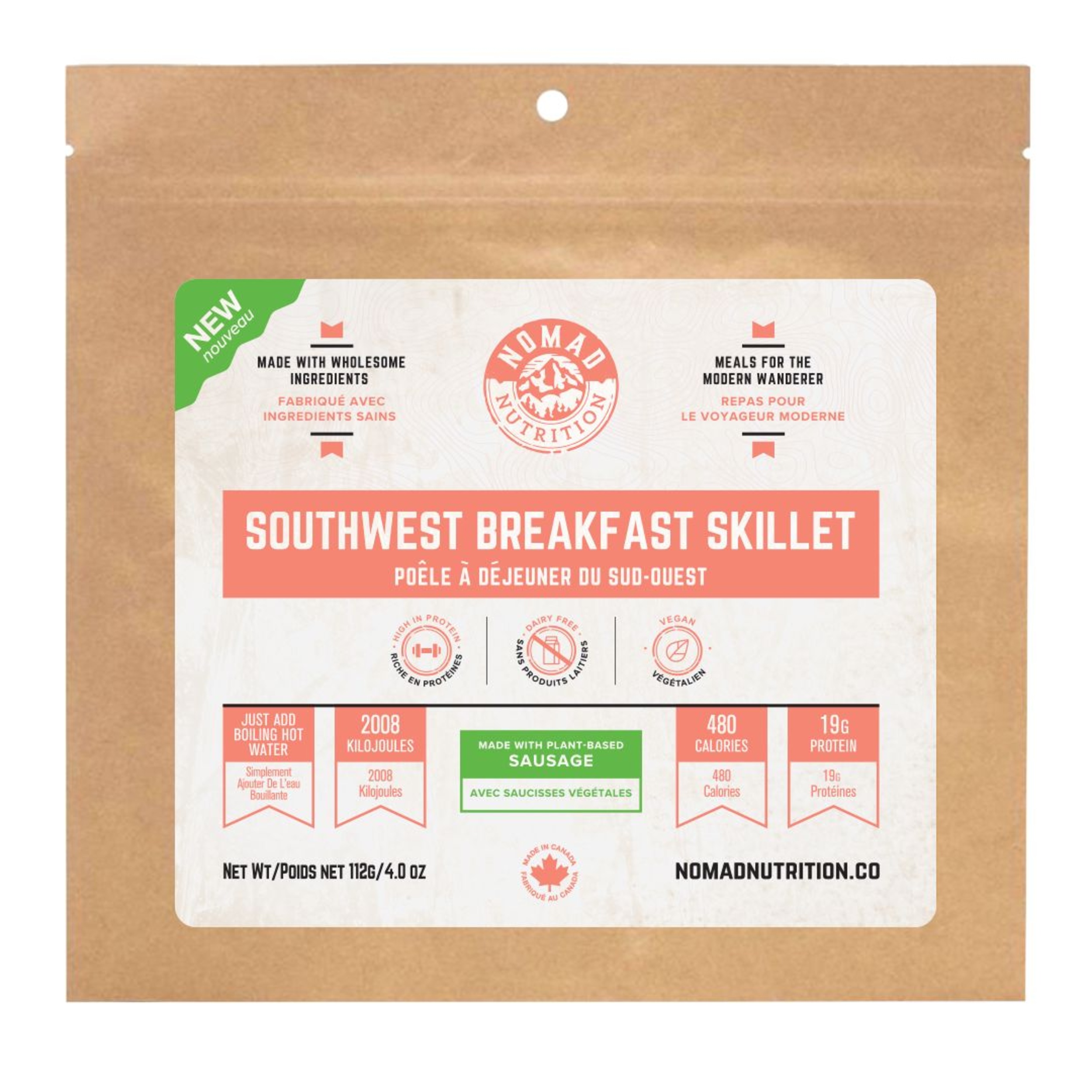 The Nomad Southwest Breakfast Skillet is a dehydrated vegan breakfast that spices up your morning. Made for adventures, it blends vegan sausages, eggs, hash browns, and red peppers into a high-protein meal. Convenient for camping and travel, this Southwest-style breakfast skillet delivers bold flavour wherever your journey takes you.