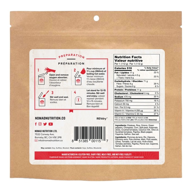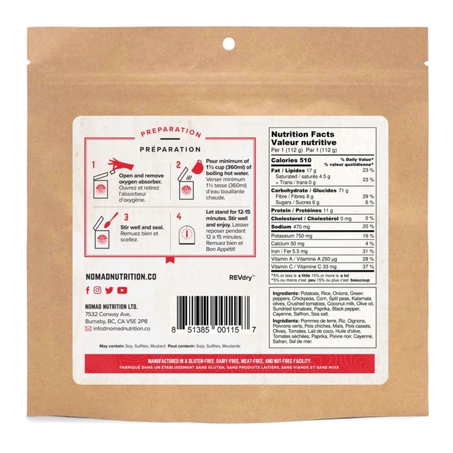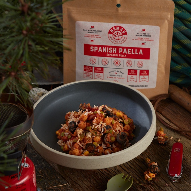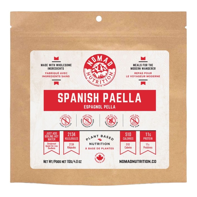Discover a taste of Spain in the great outdoors with this Nomad Spanish Paella. Simply add hot water to this quick, all-natural meal to enjoy a preservative-free, vegan-friendly dish in minutes. Gluten-free, peanut-free, dairy-free, and non-GMO, this Nomad meals is packed with energy from ingredients you can trust, making it a great choice for active, healthy lifestyles.
