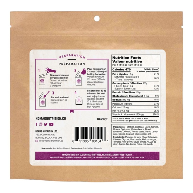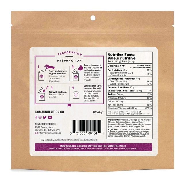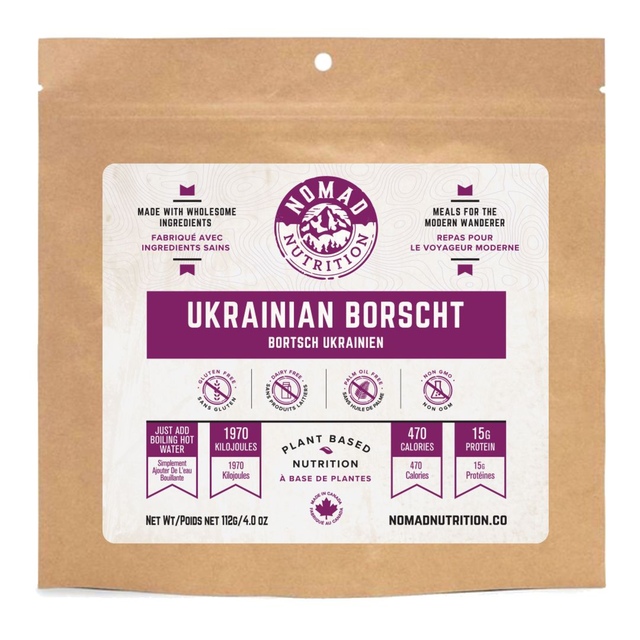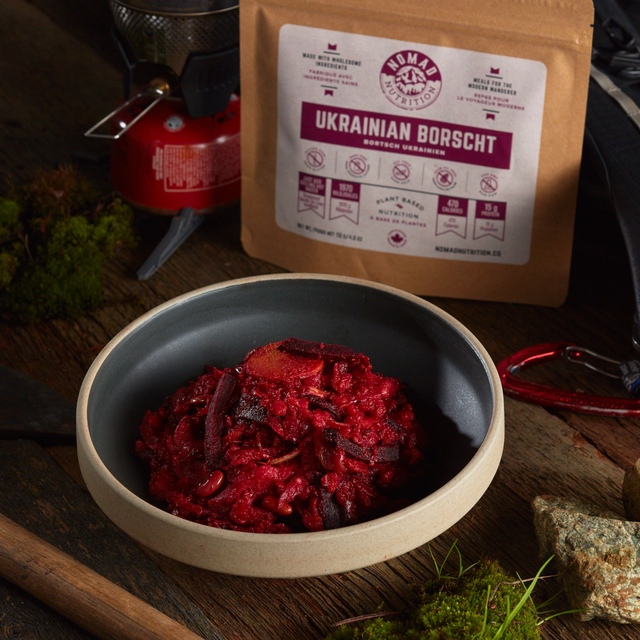 The Nomad Ukrainian Borscht is a modern take on a classic beet and cabbage soup, straight from the heartland. This high-energy, nutritious soup is packed with beets, cabbage, dill, and aromatic spices, all crafted from an authentic recipe designed by mothers to make any grandma jealous. With all-natural ingredients you can easily recognize, it's ready in minutes by simply adding hot water. Enjoy a taste of tradition and nutrition with Nomad Ukrainian Borscht.
