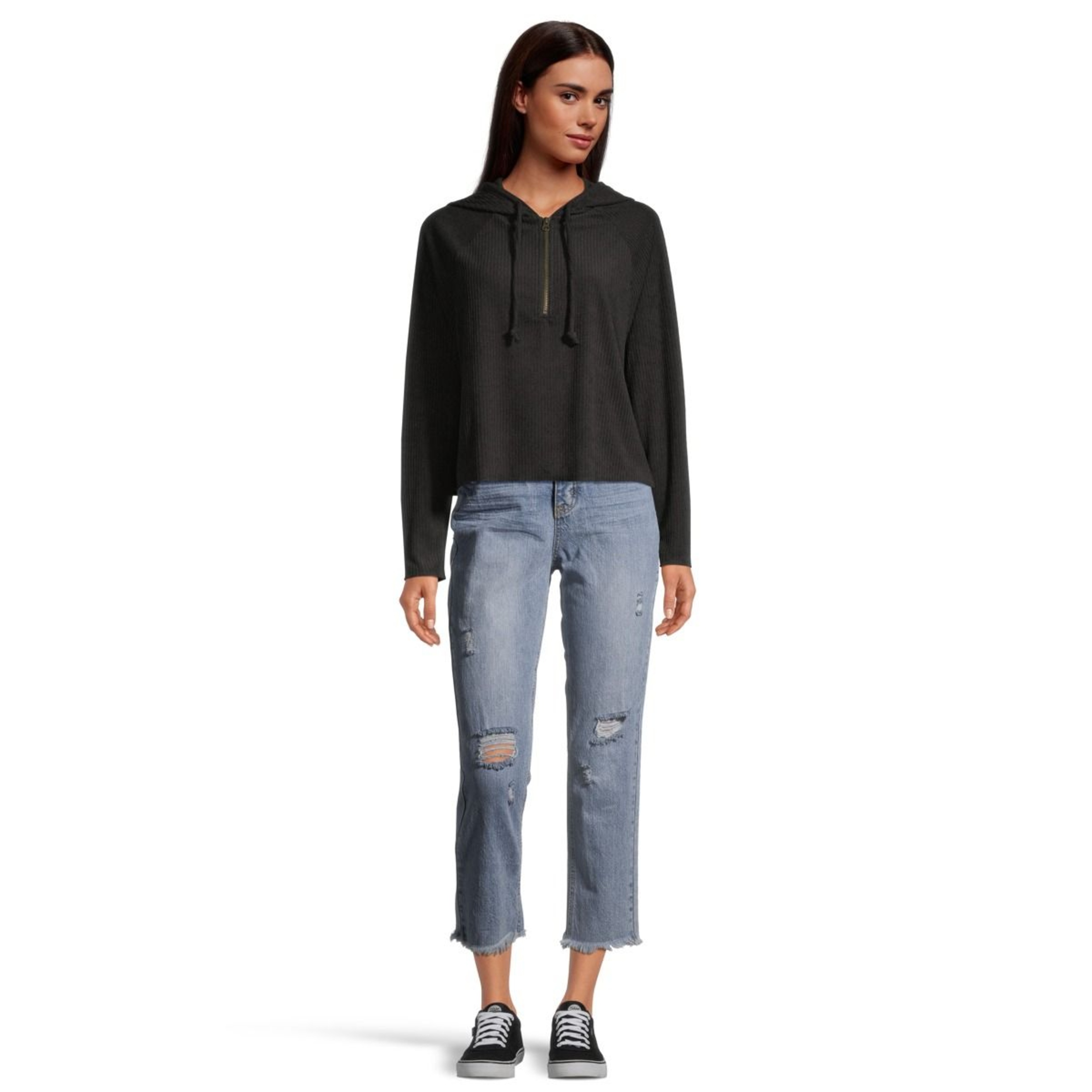 Enhance your casual wardrobe with this O'Neill Women's Cammie Terry Top. Designed for comfort, it features a quarter zip closure, raglan sleeves and a functional hood with drawcord. The merrowed edge, metal zipper and metal logo badge on the O'Neill top add elegant touches.