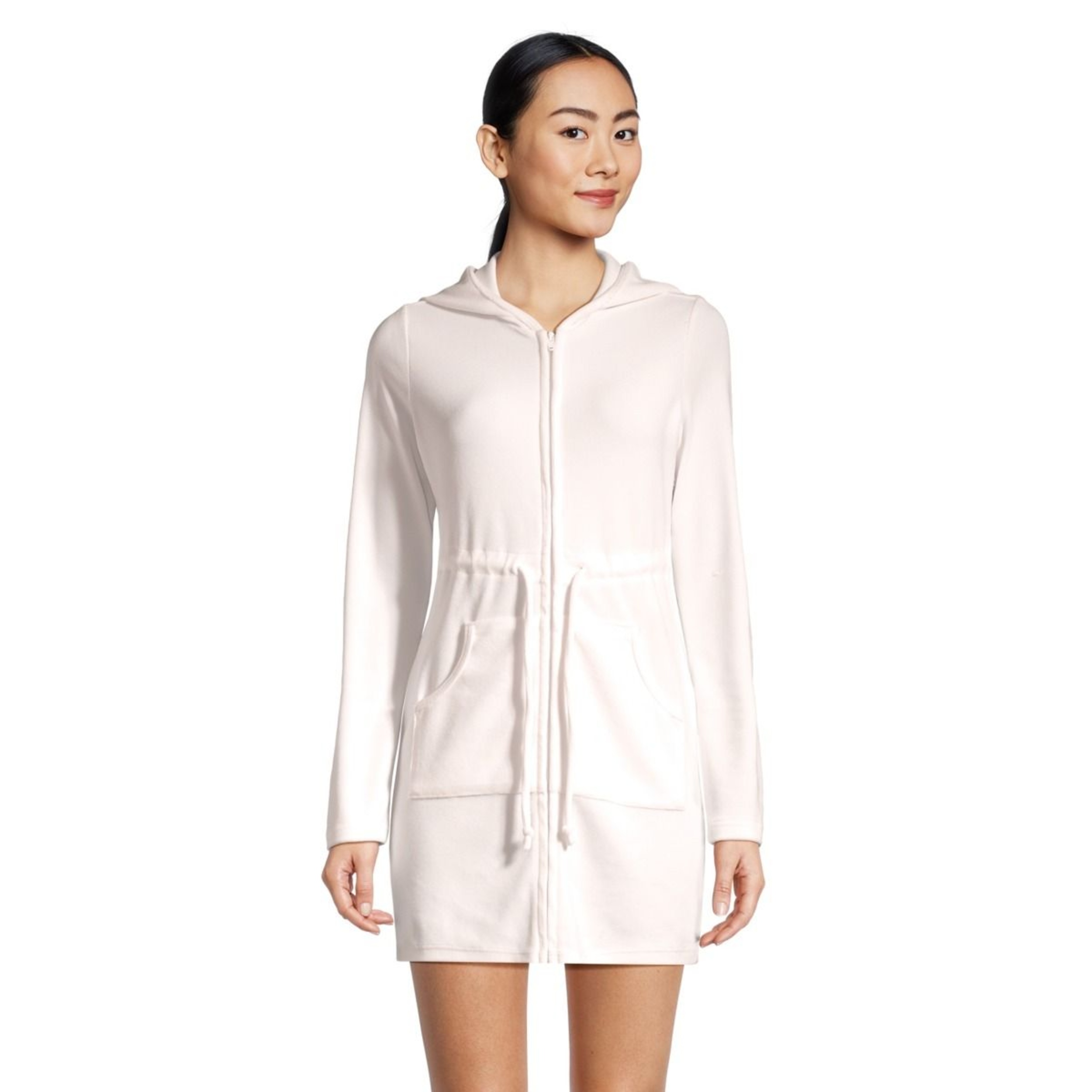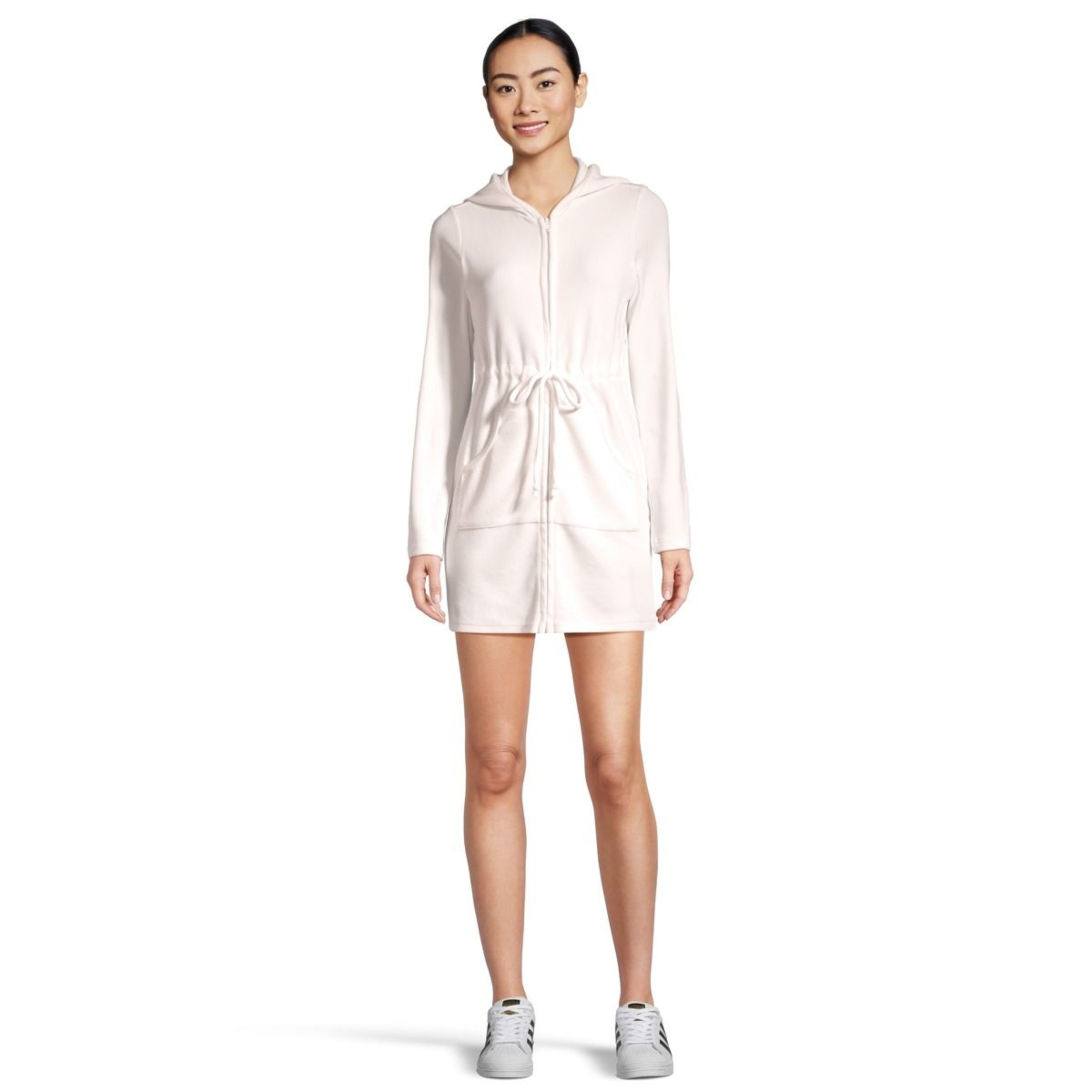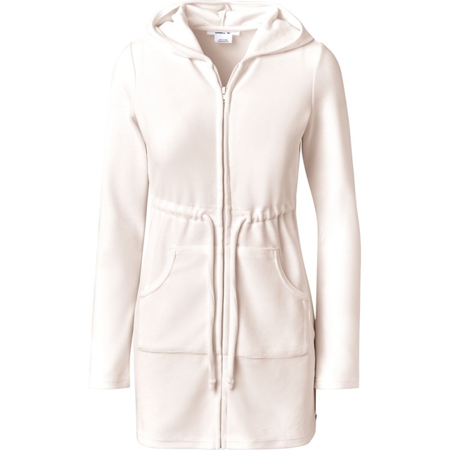 The stylish O'Neill Women's Terry Swim Cover Up Dress is ideal for poolside lounging. This full-zip, hooded cover-up features front pockets and a cropped length for hassle-free sunbathing. Crafted from quick-drying terry material, it keeps you cool while you relax by the pool.