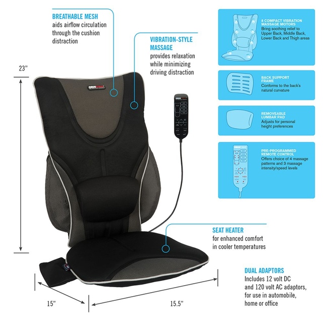 This innovative back rest comes with an adjustable lumbar pad, heat, and massage - all designed to provide you with the ultimate comfort on the road. Perfectly aligns with your back's natural curve. The heat function enhances comfort during cold weather drives while the massage feature gives you a spa-like experience, right in your car. Transform your daily commute into a relaxing journey with this versatile seat cushion