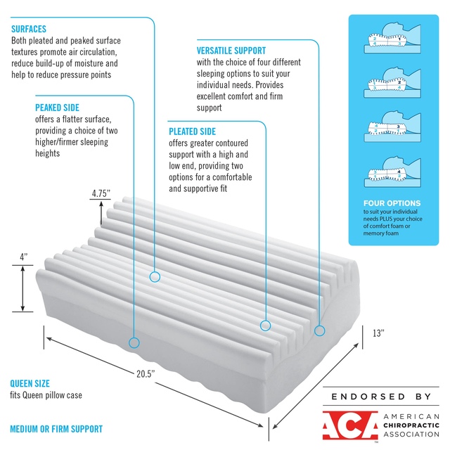 COMFORT FOAM PILLOW: Peaked comfort foam side offers a flatter surface, providing a choice of two higher/firmer sleeping heights