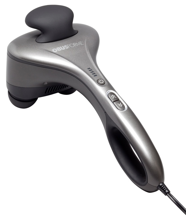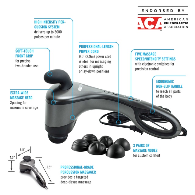 A professional-grade back massager for the comforts of home. The whisper-quiet percussion massager provides a targeted deep tissue massage on tired, aching muscles with five intensity settings for precision. Custom comfort comes from interchangeable multi-density massage nodes that span an extra-wide massage head for maximum coverage. An ergonomic non-slip handle reaches all areas of the body while the extra-long cord keeps you free to move. Now you can say goodbye to those knots and kinks and hello to relaxation.