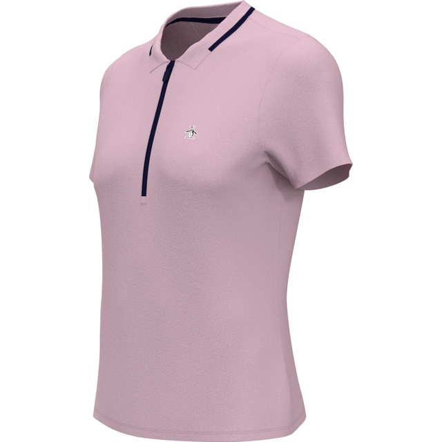 The Original Penguin Women's Rib Zip Polo T Shirt combines style and performance. Crafted from moisture-wicking fabric, it keeps you cool and dry during active wear. Made with recycled materials, this polo t shirt embraces sustainability. The stretchy fabric allows ease of movement. A metallic zipper adds a touch of flair to this versatile top.