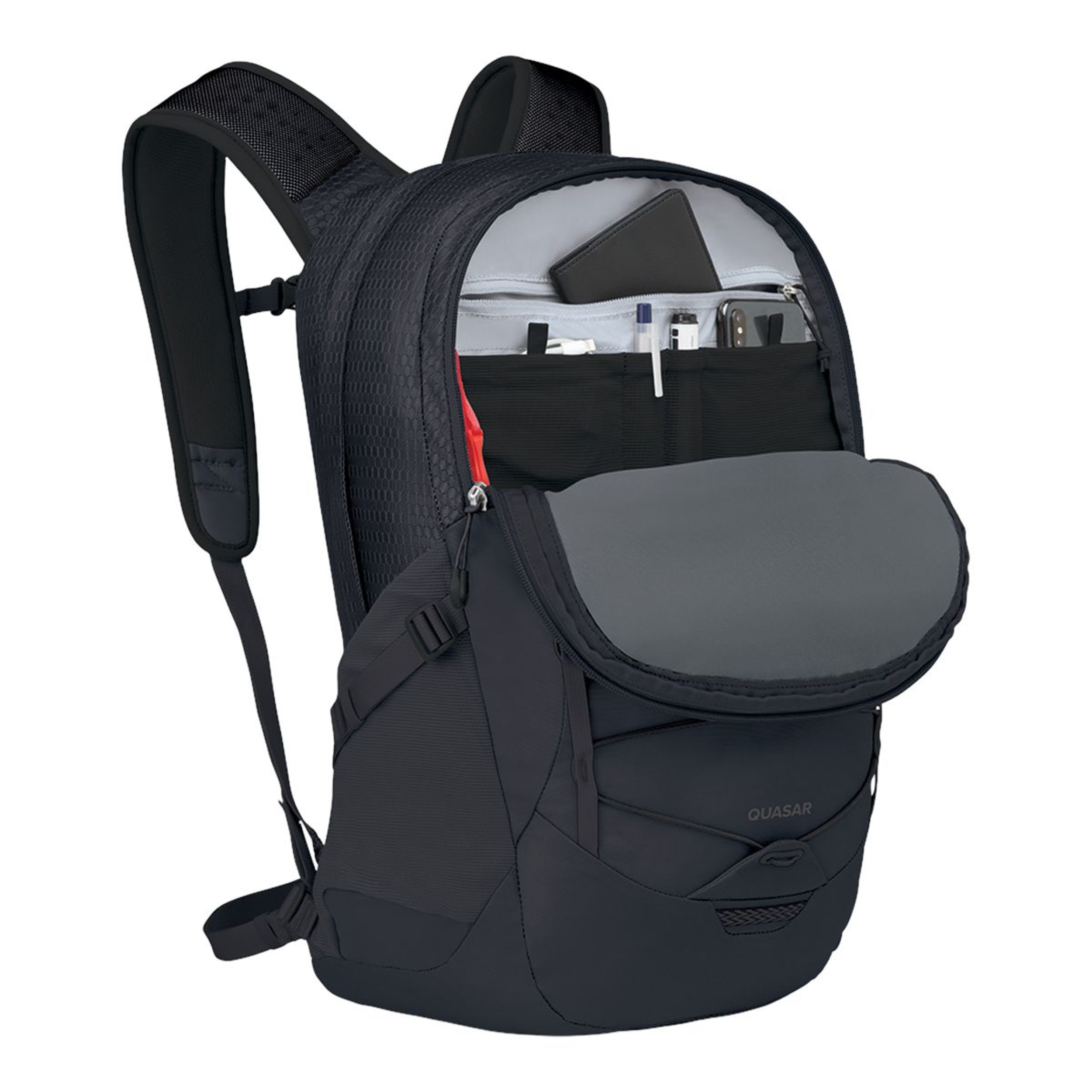 The Osprey Quasar 26 Daypack melds sophisticated design with practical functionality. It features multiple organization pockets, a padded laptop sleeve and comfortable suspension. The Osprey backpack has a scratch-resistant zip pocket, dual mesh bottle pockets and a front panel bungee system that, combined, enhance accessibility and convenience.