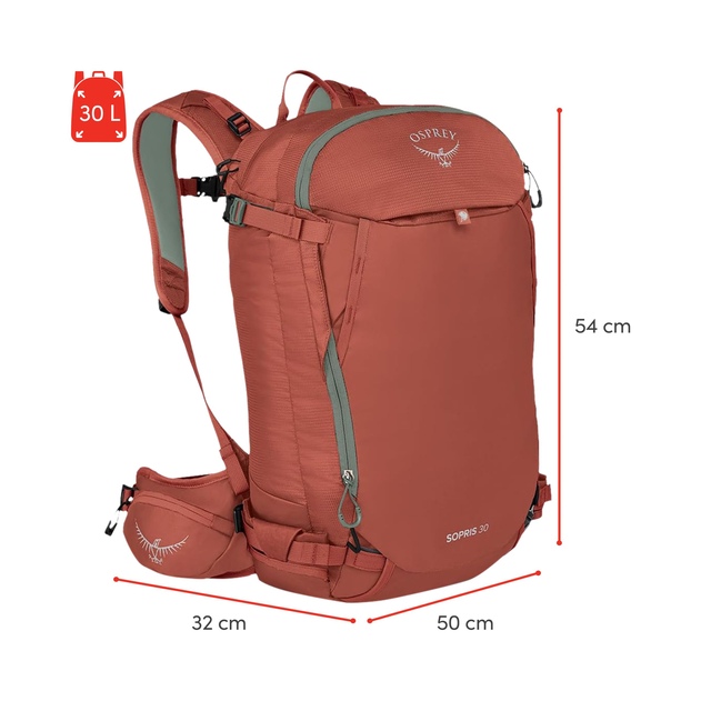 The Osprey Women's Sopris 30 Touring Pack is designed for the adventurous woman. With plenty of storage, it features a large front panel J-zip for avalanche safety gear, back panel access to dry storage and a stow-away helmet carry. This Osprey pack also has versatile ski and snowboard carry options for accessible mountain touring.