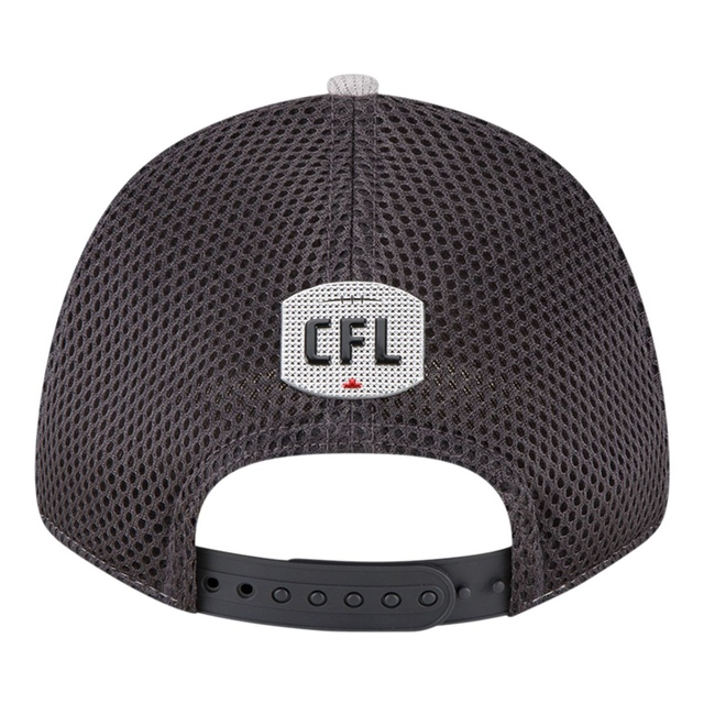 Ottawa Red Blacks Sideline alternate cap. This 9FORTY stretch snap cap has grey pivot mesh front panels and visor along with graphite spacer mesh mid and rear panels. Red Blacks logo is embroidered in grey tonal colours with a team colour pop outline. This cap has a stretch headband for comfort an adjustable plastic bartack closure at rear. A metallic chrome CFL badge adorns the back of cap above closure.