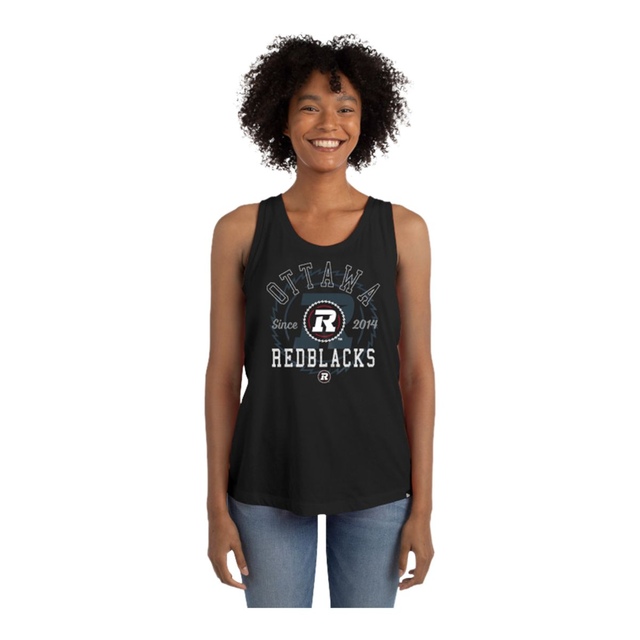 CFL - Ottawa Redblacks Women's tank top. Team color with split back. Redblacks logo with football themed glitter print on front