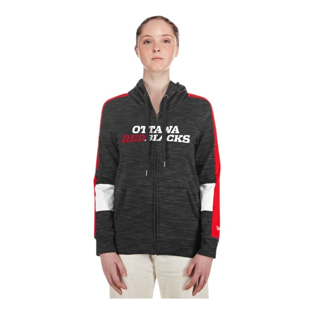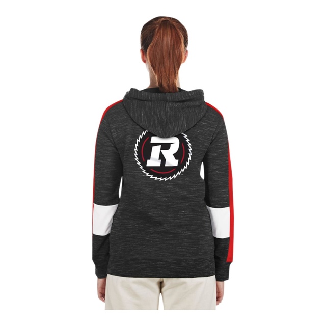Ottawa Redblacks women's CFL full-zip hooded sweatshirt. Team Color space-dye fabrication with secondary team color striping down the outside of sleeves. Redblacks wordmark screened across the front chest, and large team primary logo screen-printed on the back.