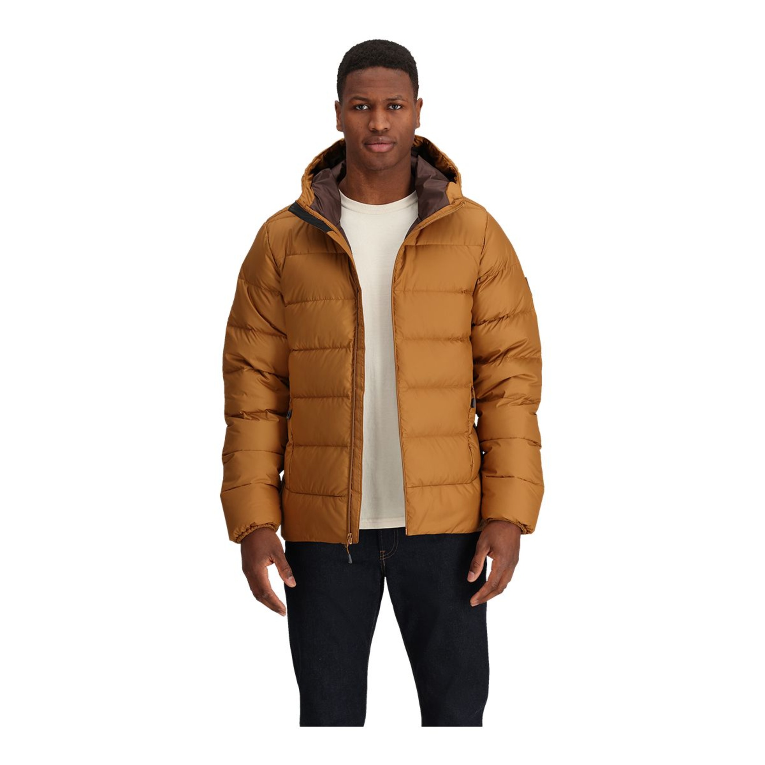 The Outdoor Research Men's Coldfront Down Hoodie is designed for warmth and sustainable performance. It features 700+ fill power responsibly sourced down insulation, combined with a 53% recycled ripstop exterior for wind and weather resistance. VerticalX™ ECO insulation on the shoulders and cuffs enhances heat retention in key areas, while the adjustable hood, brushed tricot-lined hand pockets, and elastic drawcord hem add comfort and protection.