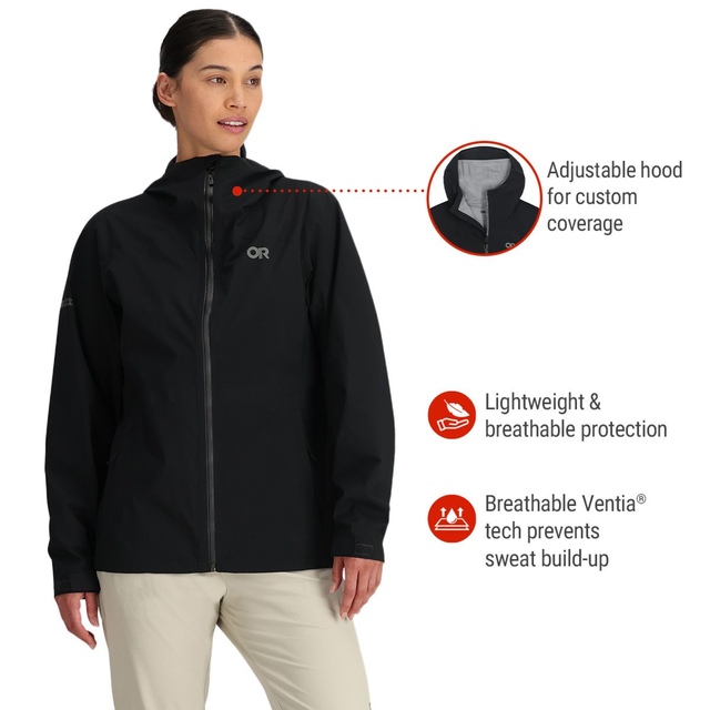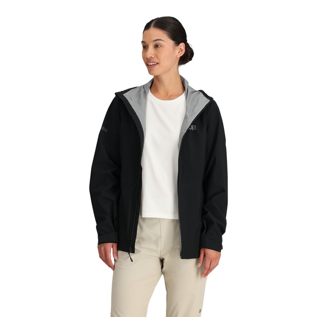 The Outdoor Research Women's Stratoburst Stretch Rain Jacket combines technical performance with sustainable materials for versatile weather protection. This lightweight, breathable rain jacket features a bluesign® approved 2.5-layer Ventia™ stretch fabric with fully-taped seams to seal out wind and moisture while allowing freedom of movement. A PFAS-free DWR treatment provides water repellency without harmful environmental impact. Convenient features include an adjustable hood, underarm pit zips for venting, zippered hand pockets, and a YKK® Aquaguard front zipper. Ideal for active outdoor pursuits like cool weather climbing or hiking.