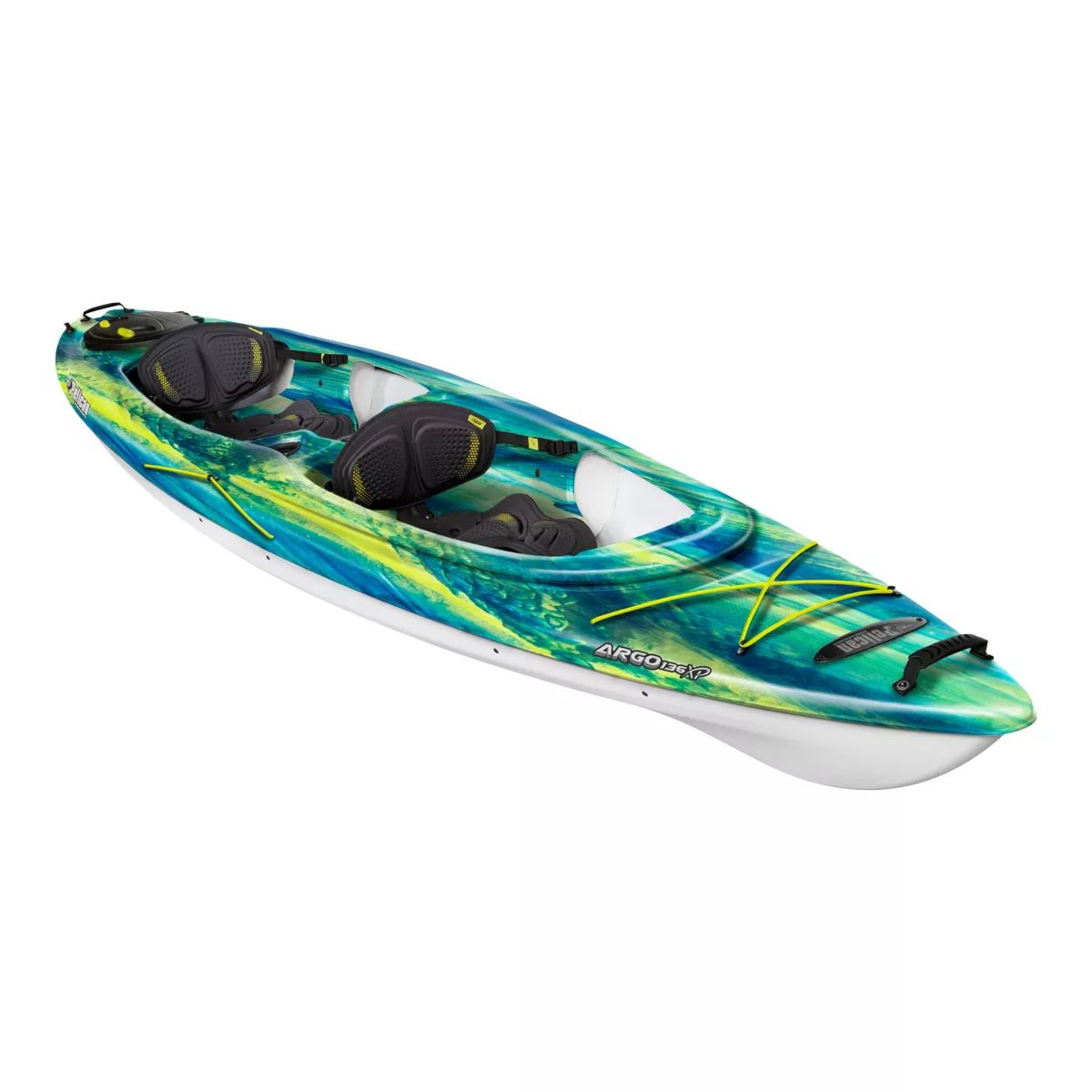 The Pelican Argo 136XP Tandem Kayak features the ERGOFIT G2™ seating system offering comfort and airflow. Its flat-bottomed multi-chine hull provides stability and easy entry. Constructed from durable high molecular weight polyethylene, this Pelican Argo 67 lb kayak includes ample storage and a keel extension for straightforward paddling.