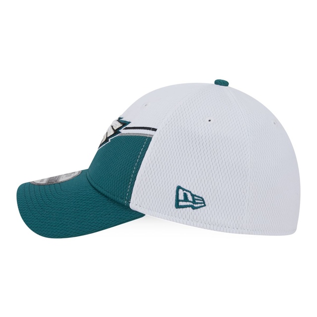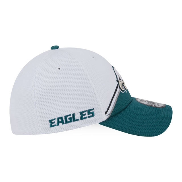 The Philadelphia Eagles 2023 Sideline White 39THIRTY Stretch Fit Cap features an embroidered Eagles logo at the split team color front panels with a matching NFL Shield at the rear. Additional details include a team wordmark at the right-wear side and a gray undervisor.