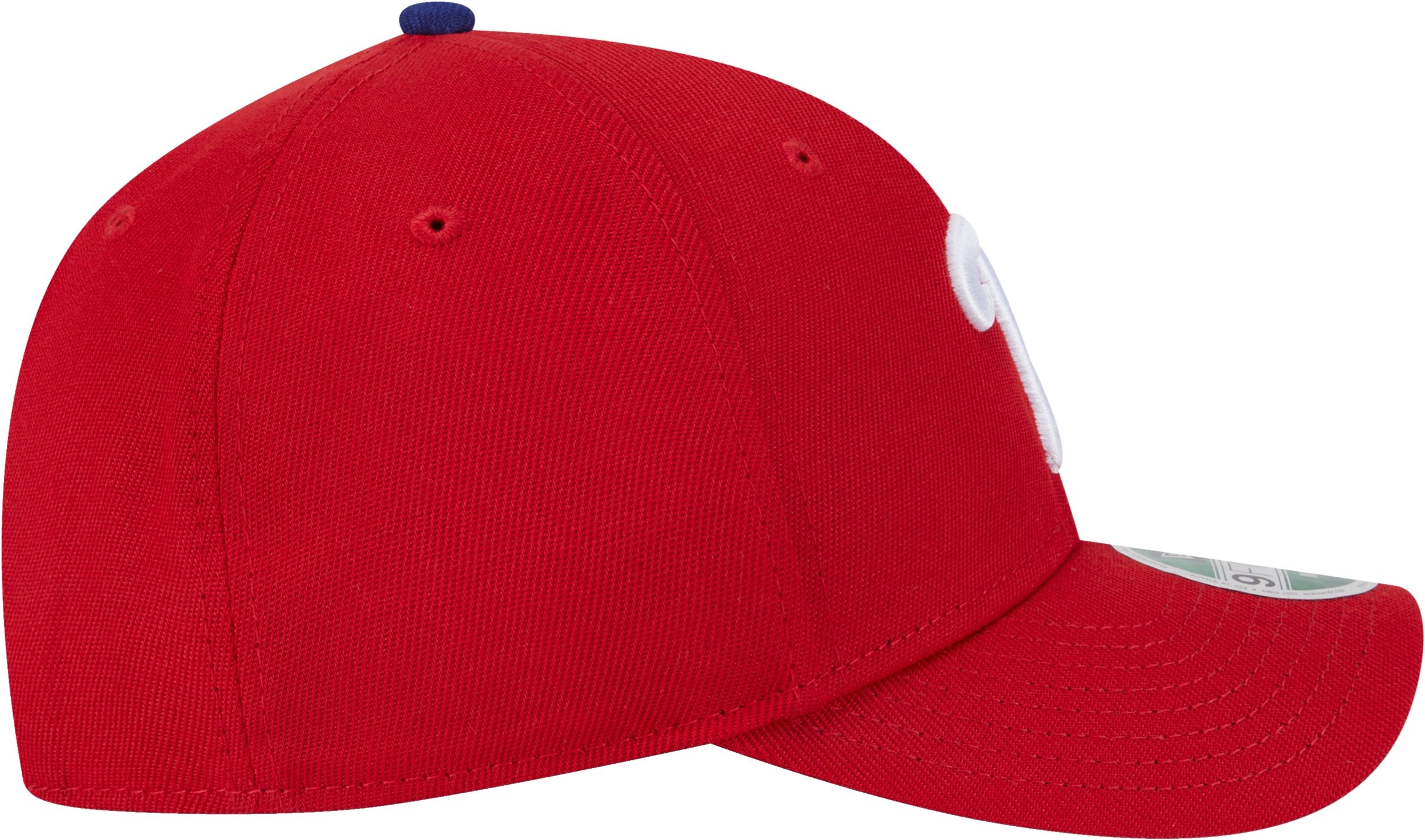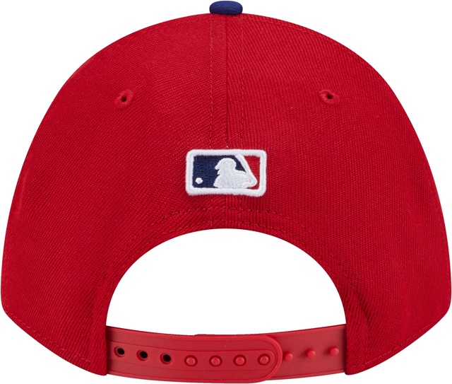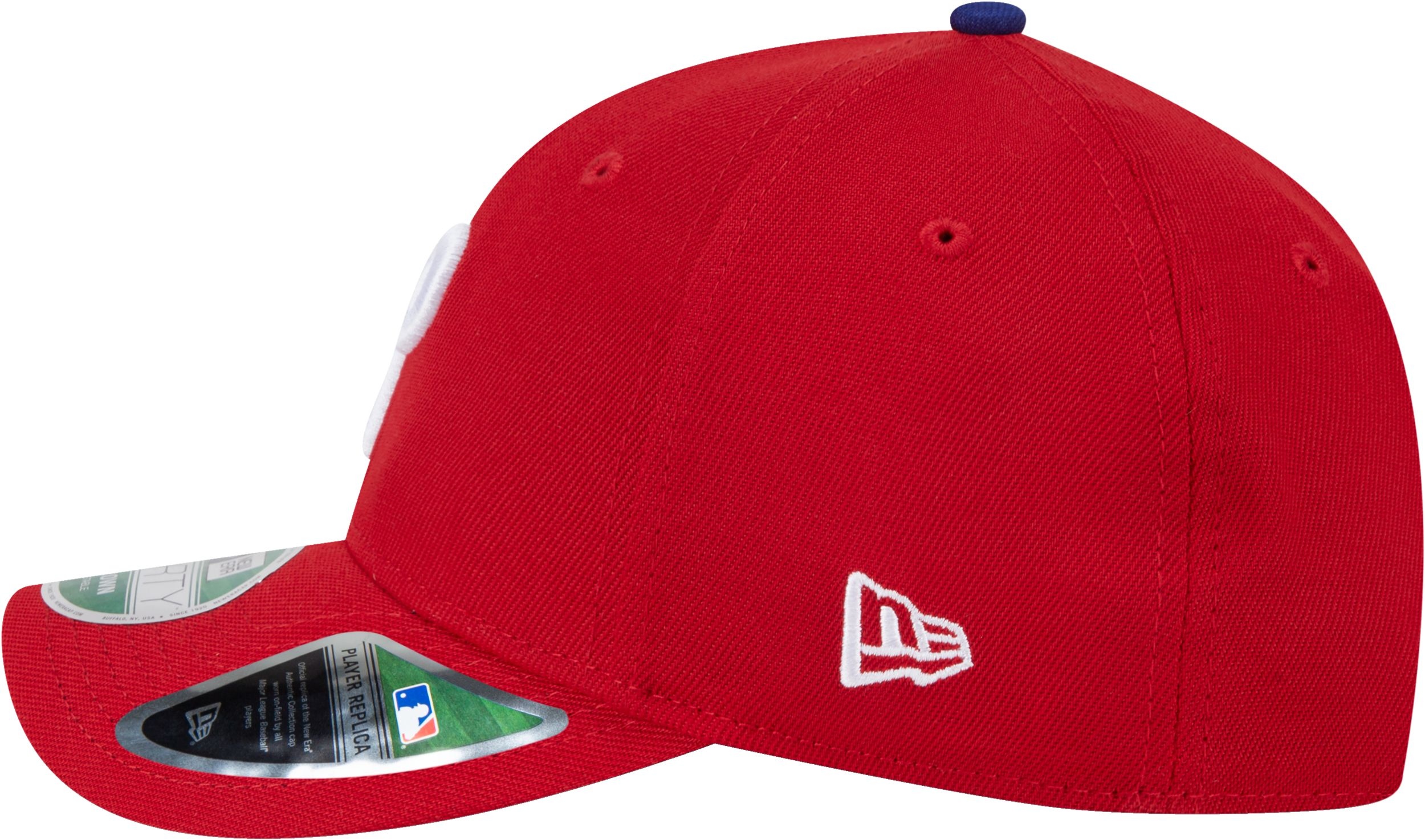 The Philadelphia Phillies New Era Player Replica 9FORTY Cap is an updated silhouette with a semi-full shape that more closely replicates the on-field cap. This modern visor is slightly shorter and less curved for minimalistic style. Embroidered Phillies logo on the front panels with a matching MLB Batterman logo above a snapback closure at the rear, finished with a black undervisor for a true replica look.