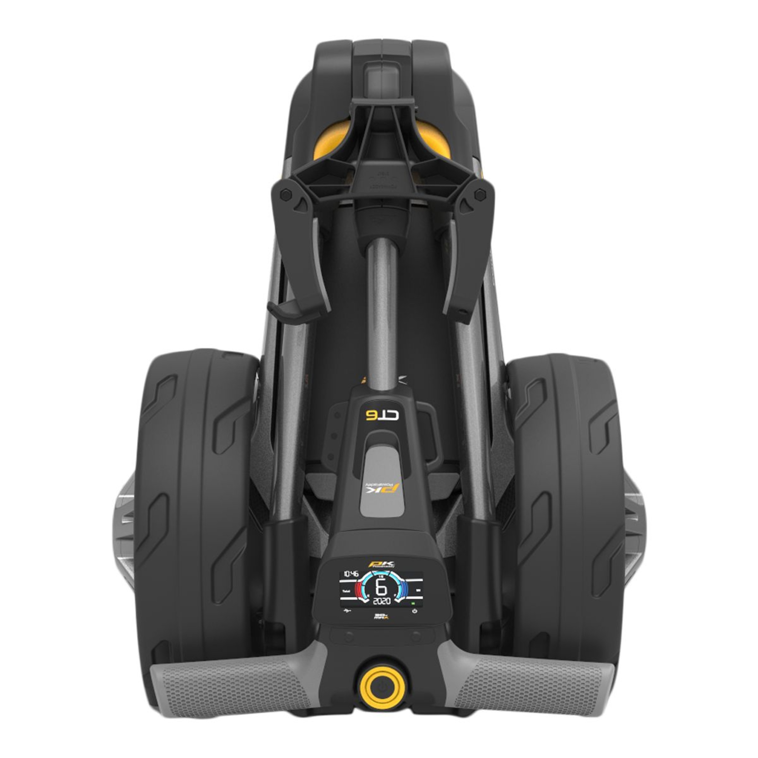 The PowaKaddy CT6 Electric Golf Trolley is an ultra-compact electric golf trolley that folds in just 2 simple steps. It features a 2.8" mid-size full color widescreen display and a USB charging port for smartphones and GPS devices. The height adjustable soft touch handle ensures a perfect fit, while the integrated carry handle makes transportation easy. The Simple-2-Fold™ system allows the CT6 to fold 20% smaller than previous PowaKaddy Compact models.