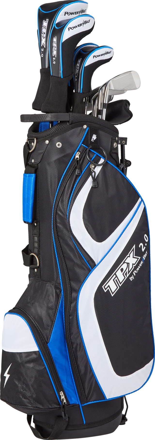 The PowerBilt TPX 2.0 Men's Golf Club Set offers forgiving performance and accuracy. Oversize titanium driver with an extra-large sweet spot provides longer, straighter drives. Forged cavity back irons enhance forgiveness and control. Lightweight stand bag with dual shoulder straps ensures easy, comfortable carrying.