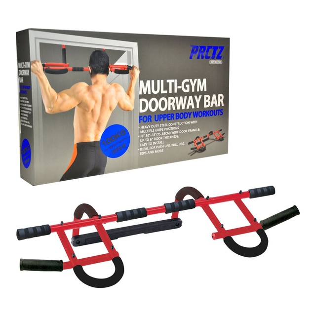 The PRCTZ Multi-Gym Doorway Bar by IBF Iron Body Fitness is ideal for pullups, pushups, dips, situps and more
