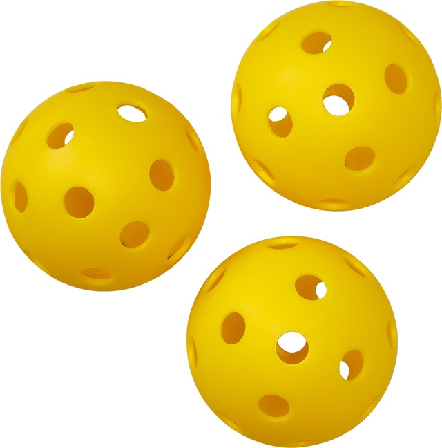 The Prince Indoor Pickleball - 3 Pack includes three yellow pickleballs specifically designed for indoor pickleball courts. With 36 surface holes, the softer plastic and larger holes improve accuracy and bounce. These pickleballs are ready for use right out of the package.