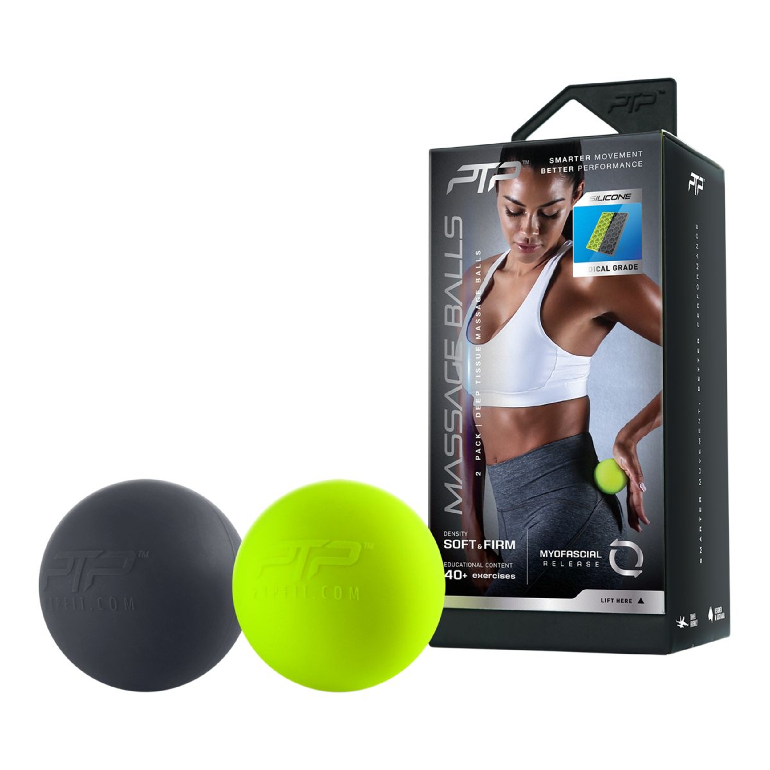 The PTP Massage Balls Combo is designed to provide a deep self-massage and relieve muscle pain on the arches of the feet, glutes, hips, back, shoulders, forearms and more. With two levels of tissue massage, these massage balls allow you to use soft or firm pressure to help your muscles recover faster.