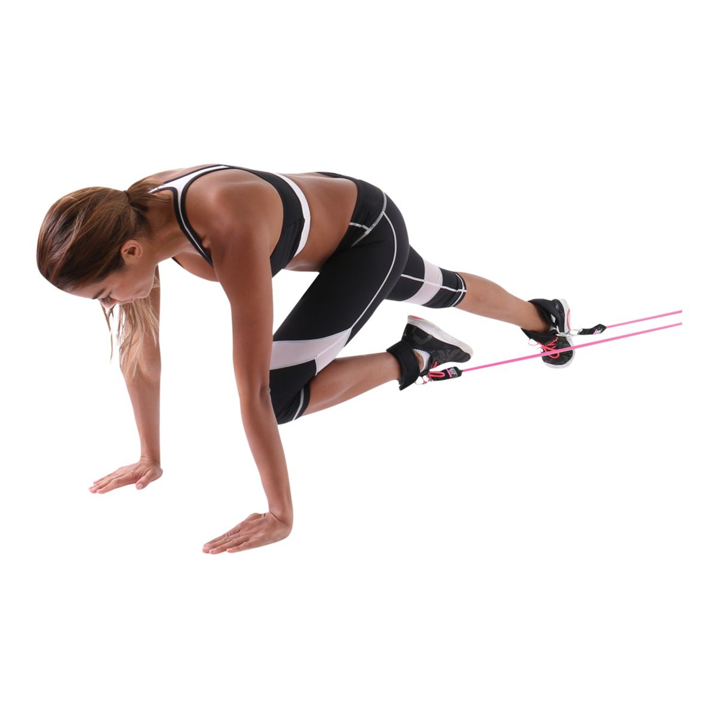 5 resistance tubes with carabiners, handles, adjustable ankle straps, door and outdoor anchors, booklet and carry bag
