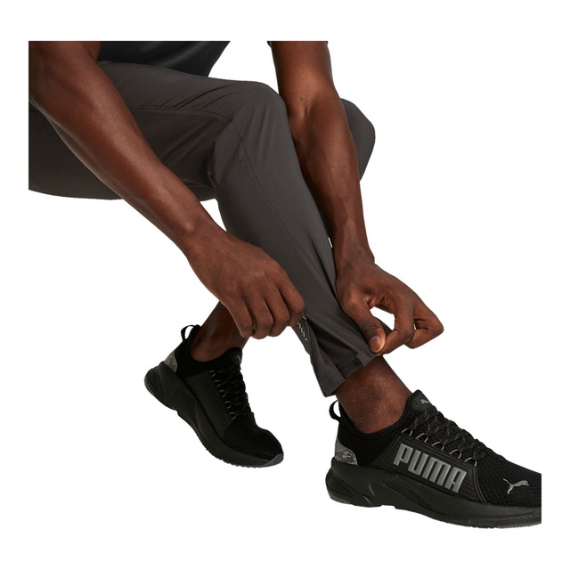 Get in the zone with these PUMA Men's Run Favorite Tapered Pants. The tapered cut and reflective design elements make for a sleek, stylish look, while bottom-leg zippers allow for an easy on-and-off. Puma's signature moisture-wicking technology will keep you cool wherever your run takes you.