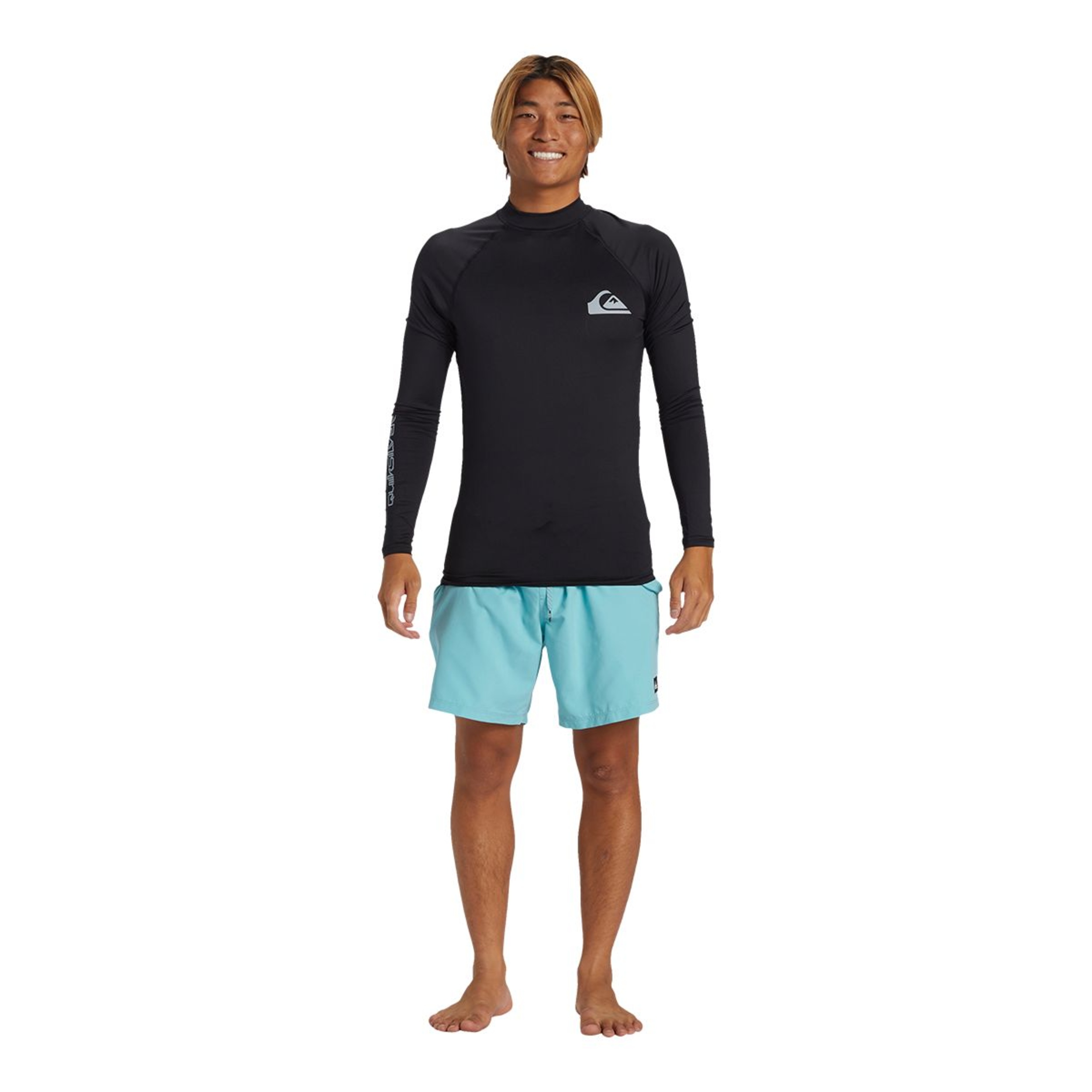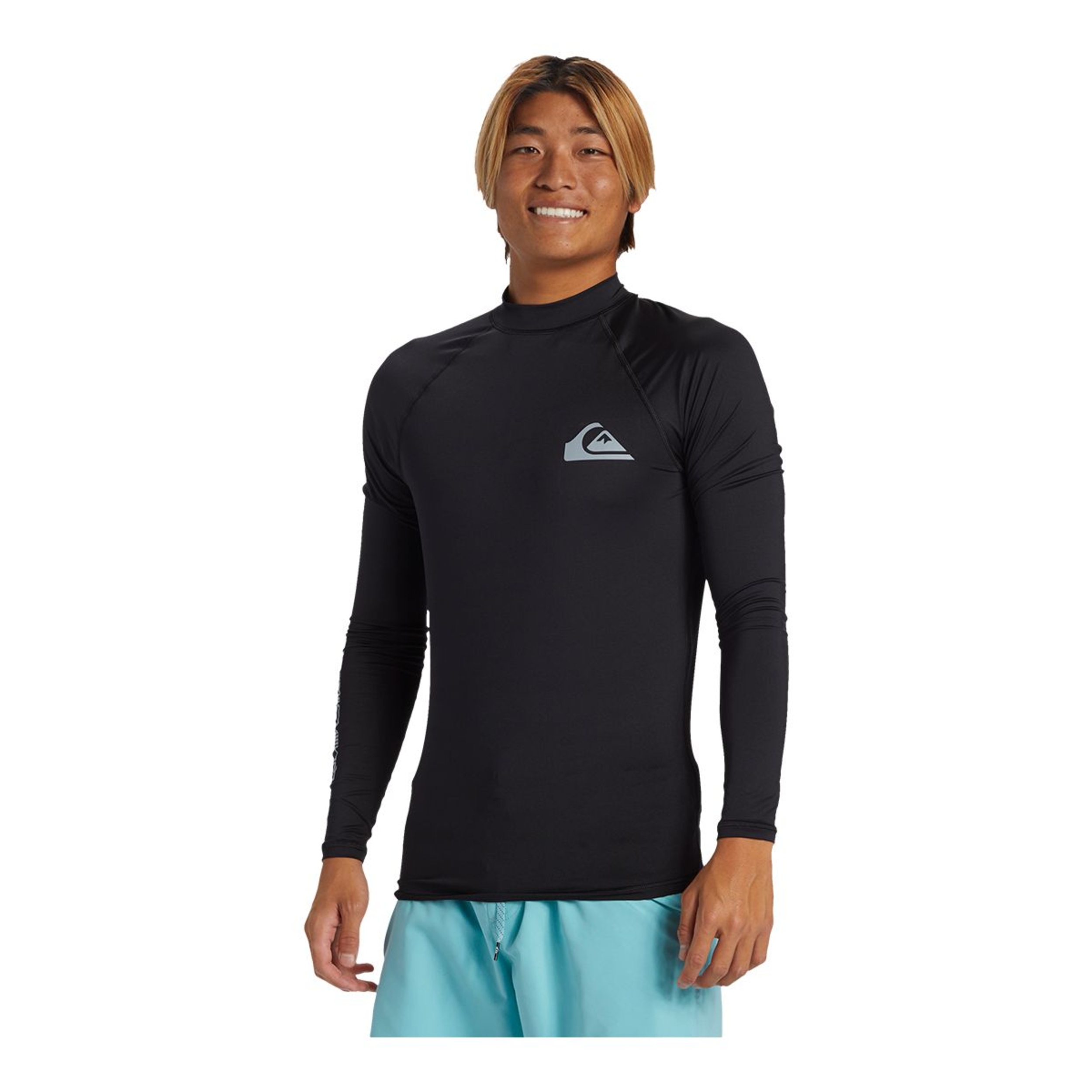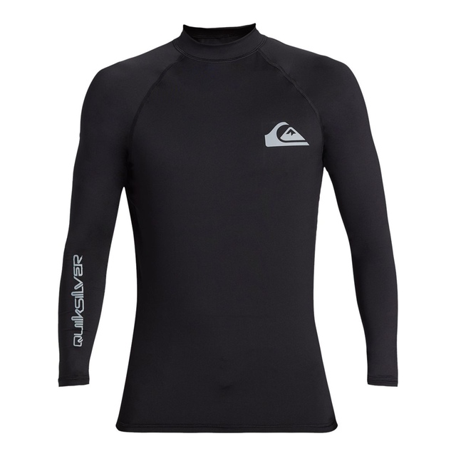 Long Sleeve UPF 50 Surf T-Shirt for Men. Features include: Collection: Everyday collection, Fabric: Recycled polyester elastane blend fabric , UVflight, a functional classic made from recycled yarn, Technology: Moisture-wicking properties pull sweat away from the skin, keeping you dry, Chlorine resistant, UV Protection: 50+ UPF sun protection , Dye: Solution dyed (black), Fit: Snug fit , Neck: Mock neck , Sleeves: Long sleeves , Closure: Pullover closure.
