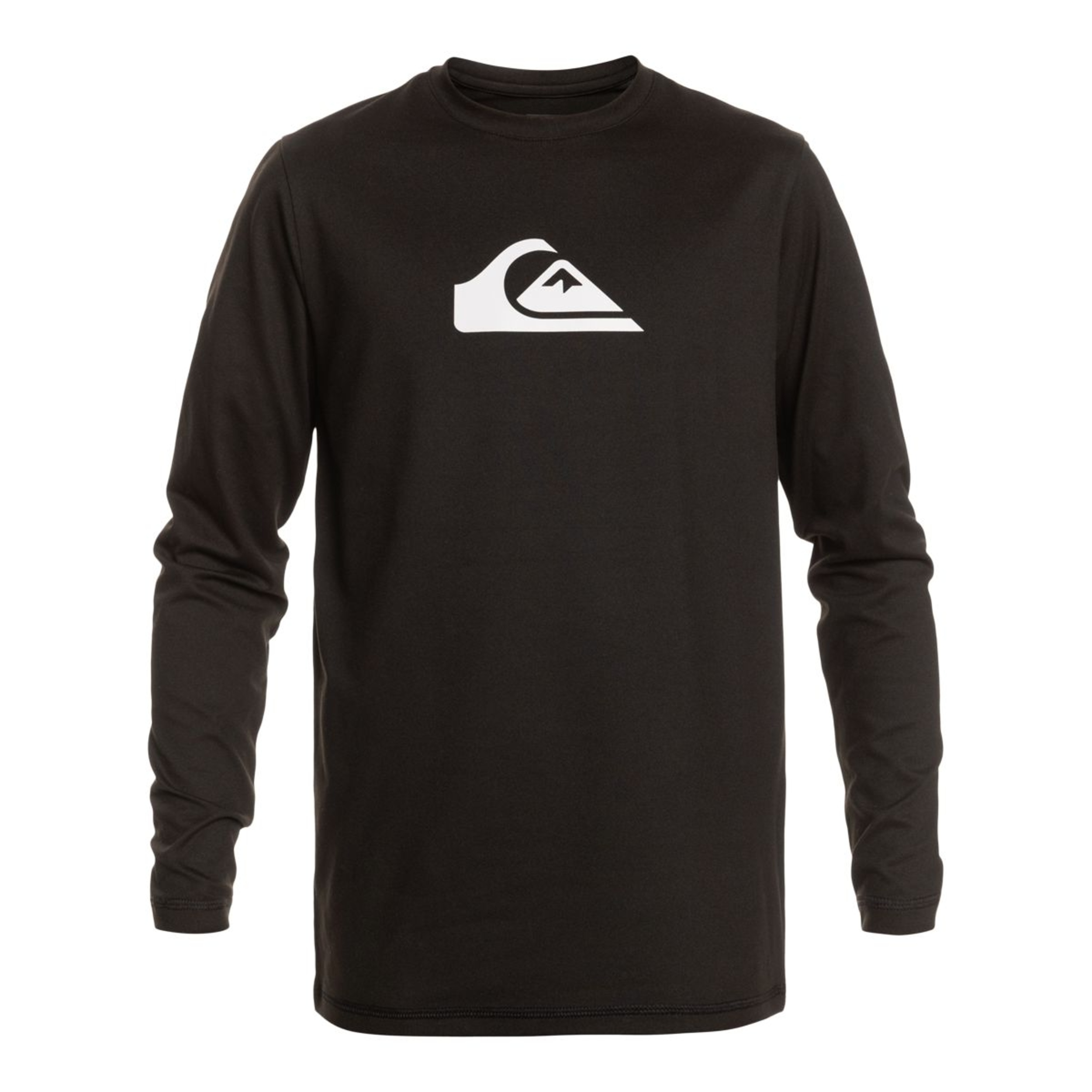 Long Sleeve UPF 50 Surf T-Shirt for Men. Features include: Eco-Conscious Fabric: Recycled polyester stretch blend fabric, Technology: Chlorine resistant and Moisture-wicking, Protection: UPF 50+ Sun protection, Sleeves: Long sleeves, Neck: Crew neckline, Hem: Straight hem, Branding: Quiksilver print on chest, Cotton-feel fine-brushed fabric made with recycled yarn.