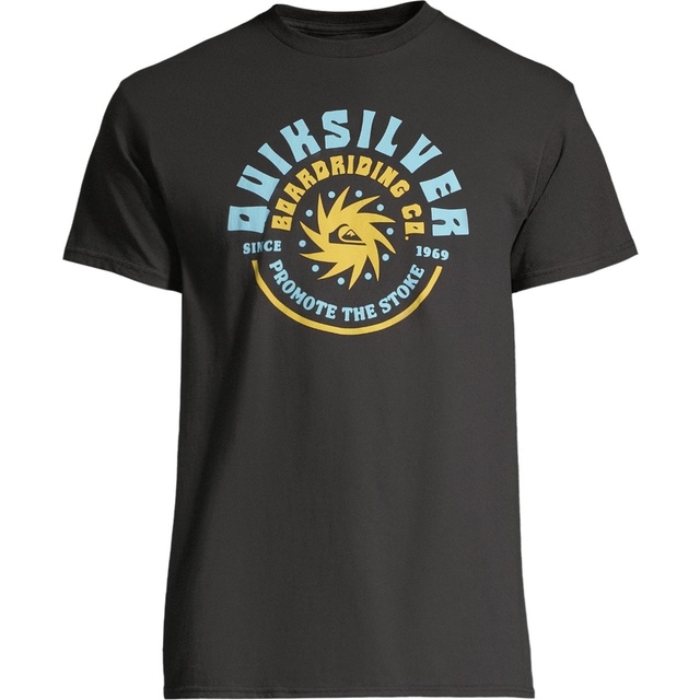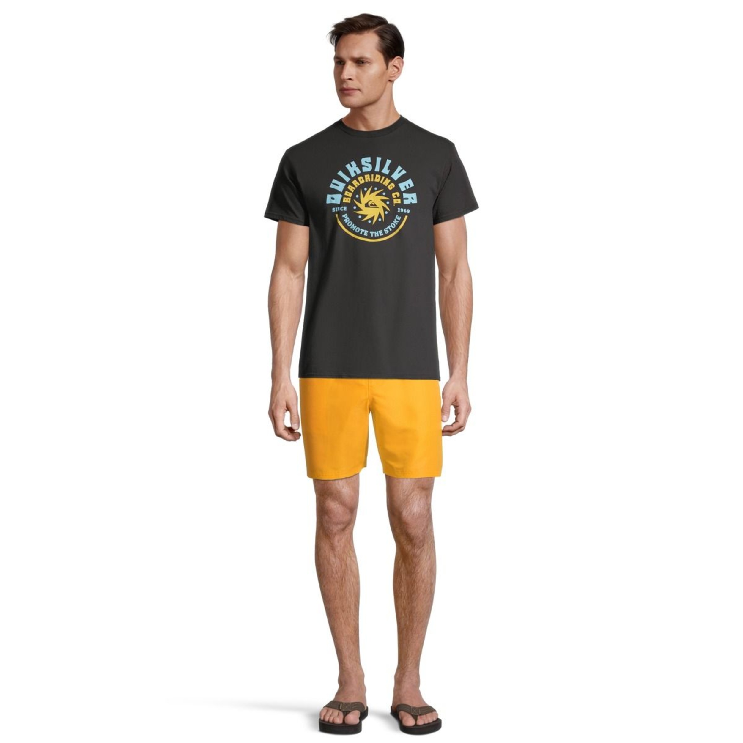 Men's regular fit tee featuring cotton jersey fabric and a soft hand-feel print, finished with Quiksilver screen graphic. Details include an interior heat sealed neck label and wrap around clip logo at bottom hem.