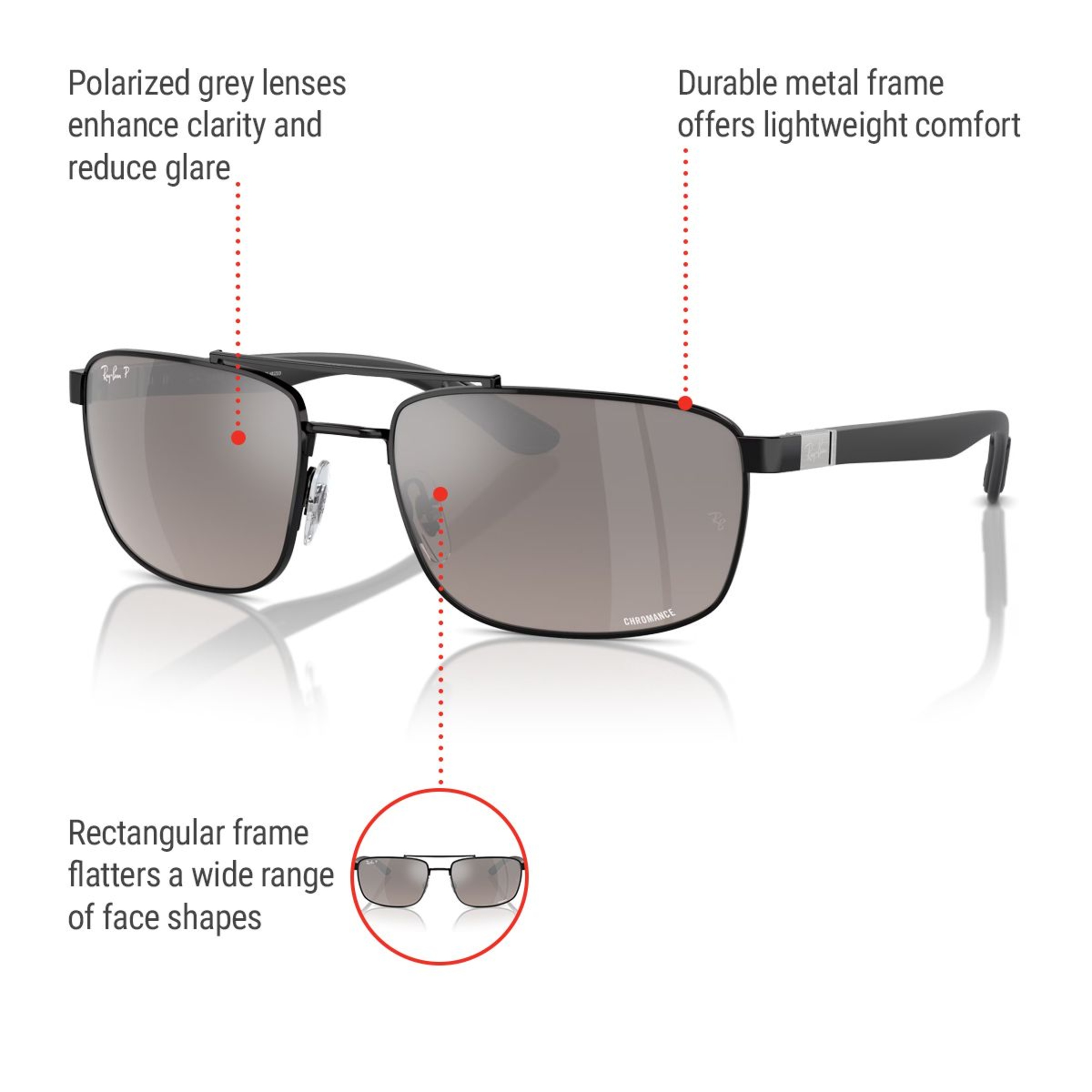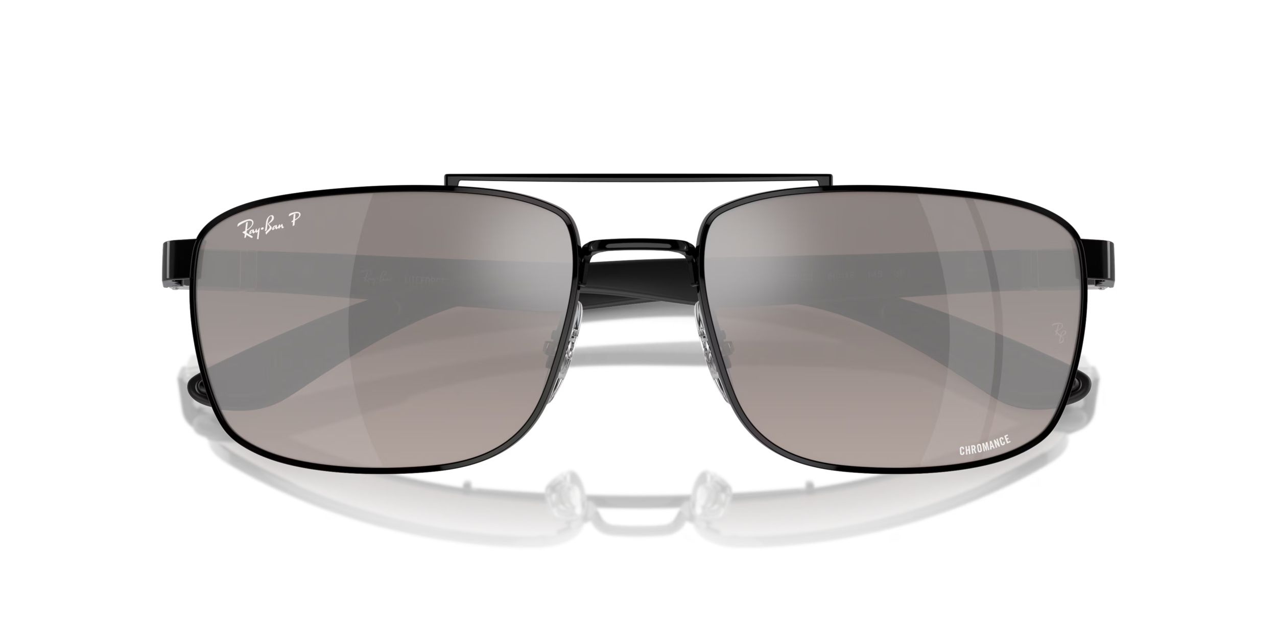 The Ray-Ban Unisex RB3737 Chromance Sunglasses combine a sleek metal frame with polarized grey lenses for enhanced clarity and 100% UV protection. The polished black finish adds durability, while the rectangular shape flatters most face shapes, offering versatility for any occasion.