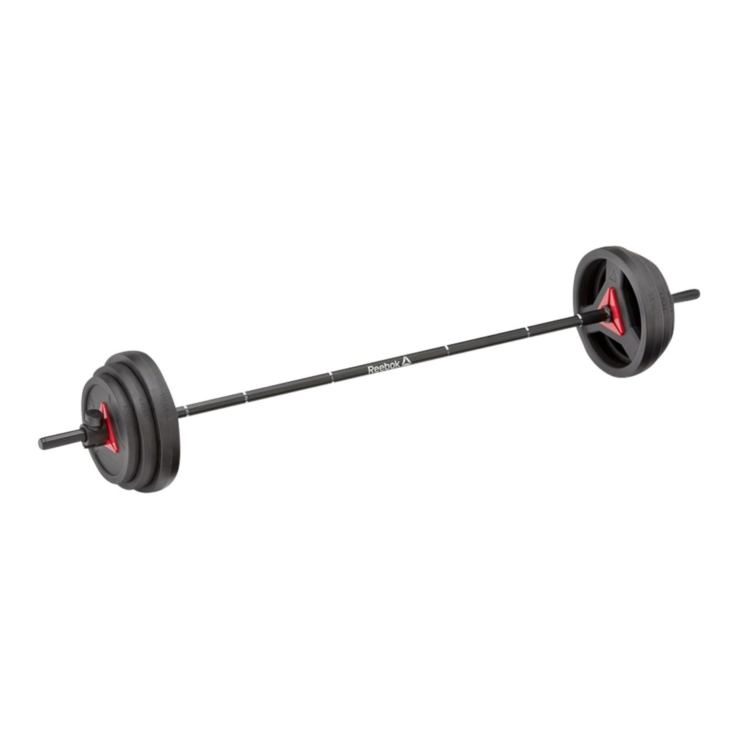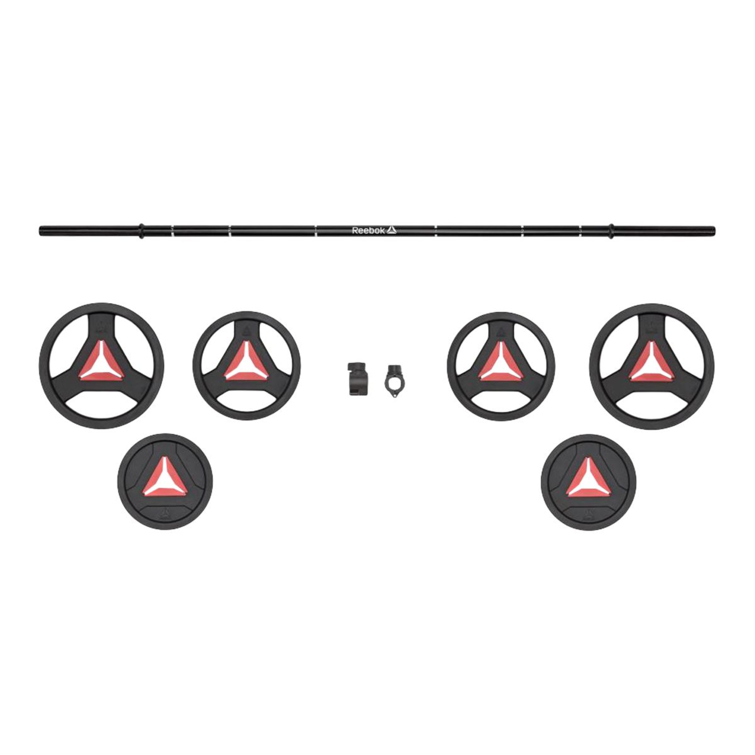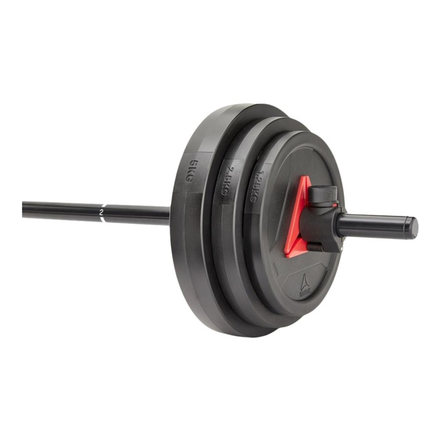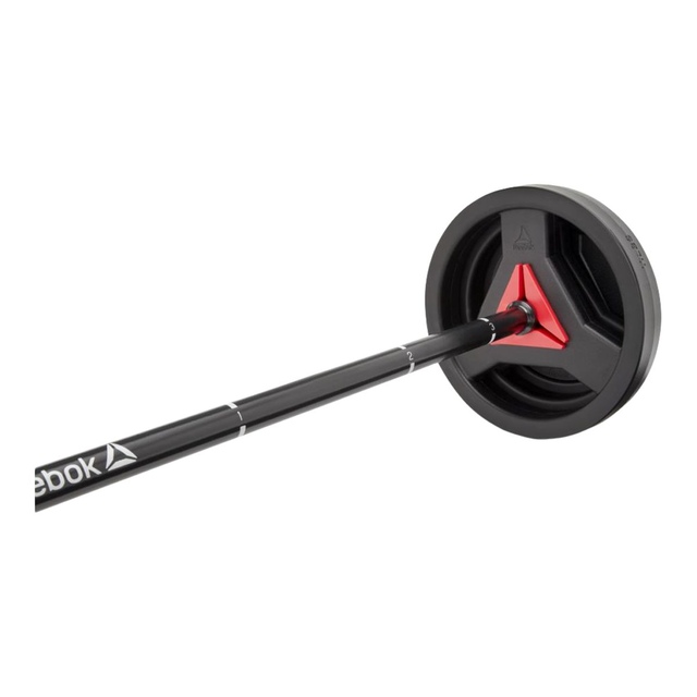 A hybrid between traditional strength training and a studio class, the Reebok weight set is fit for both home and gym environments. Durable in construction and versatile in function, the Weight Set gives you all the tools to enhance your exercise regime. Made from hardwearing steel, the weight set bar stands up to constant use. 25mm in diameter with a 2.5mm thick wall, the bar is thin enough to avoid fatiguing your forearms, yet sturdy enough to withstand a 40Kg/88lb load. Featuring numbered hand grip positions, the bar provides a template to help guide your form. Constructed with a cast iron core and a TPU outer, the weight set plates are designed with function and ergonomics in mind. Built for use on the bar or alone, the versatile plates have dual functionality with a cut-out inner section providing a natural grip for dumbbell style exercises. Including two twist-lock collars, the weight set is quick and easy to load; keeping your exercise transitions sharp.