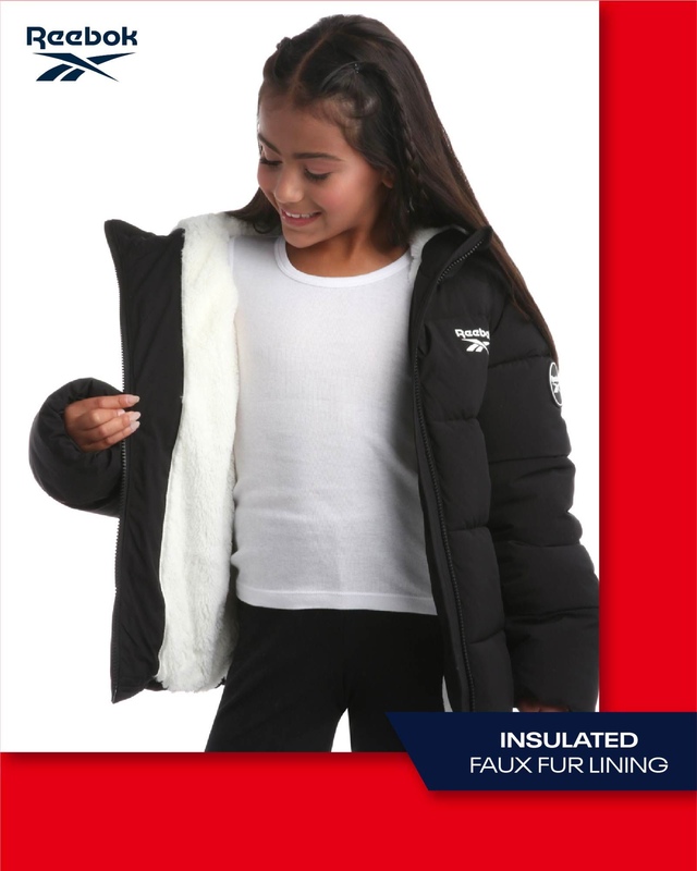 This Reebok Girls' Stretch Puffer Jacket is made from stretchy fabric for a flexible, comfortable fit. It features a lightweight, insulated puffer design to keep her warm without weighing her down. A zip-front closure and stand collar allow easy on and off. Side pockets provide a place for her hands or storing small items. The relaxed fit skims the body without feeling too snug. Whether for playtime or cold-weather layering, this pullover puffer jacket keeps her warm and active all winter long.