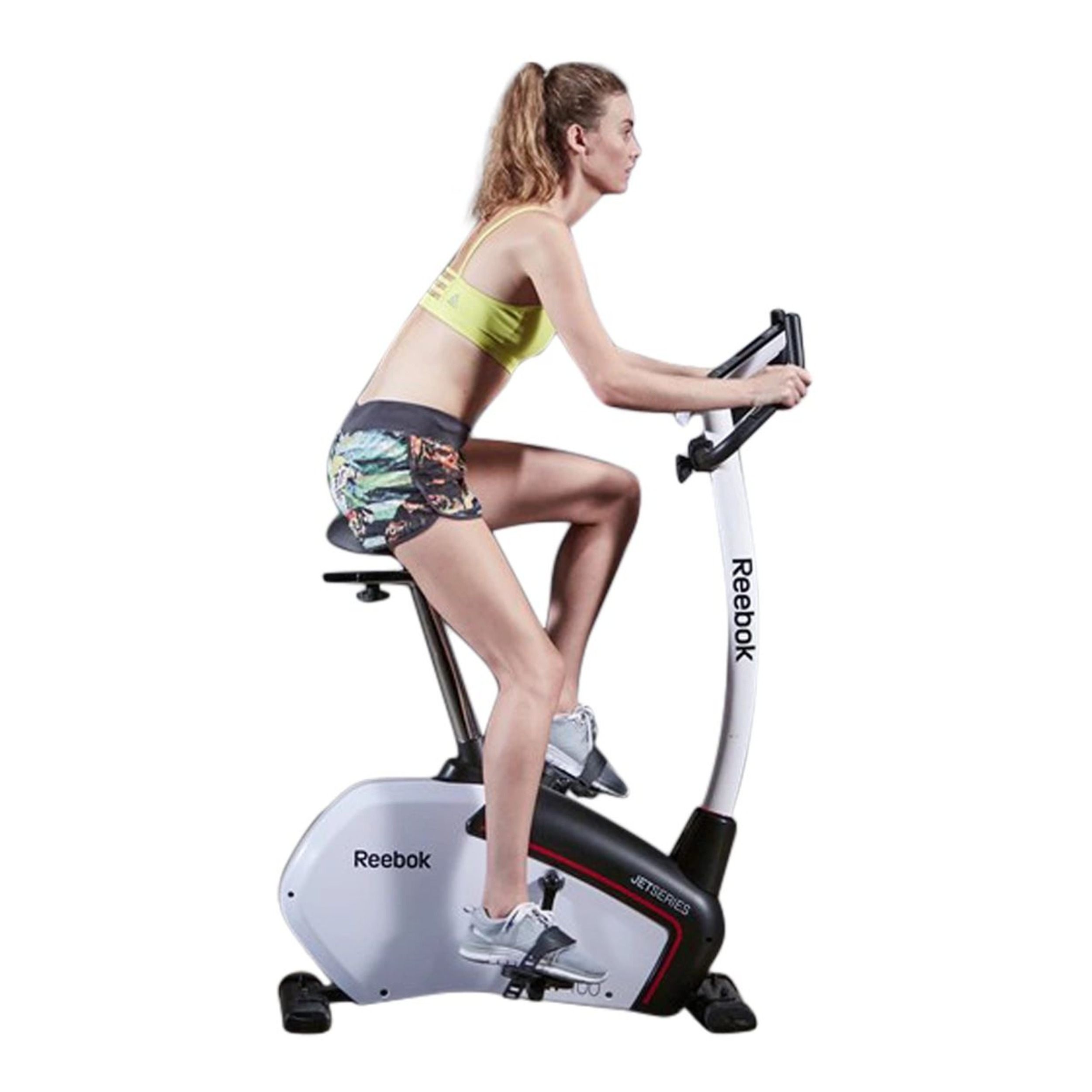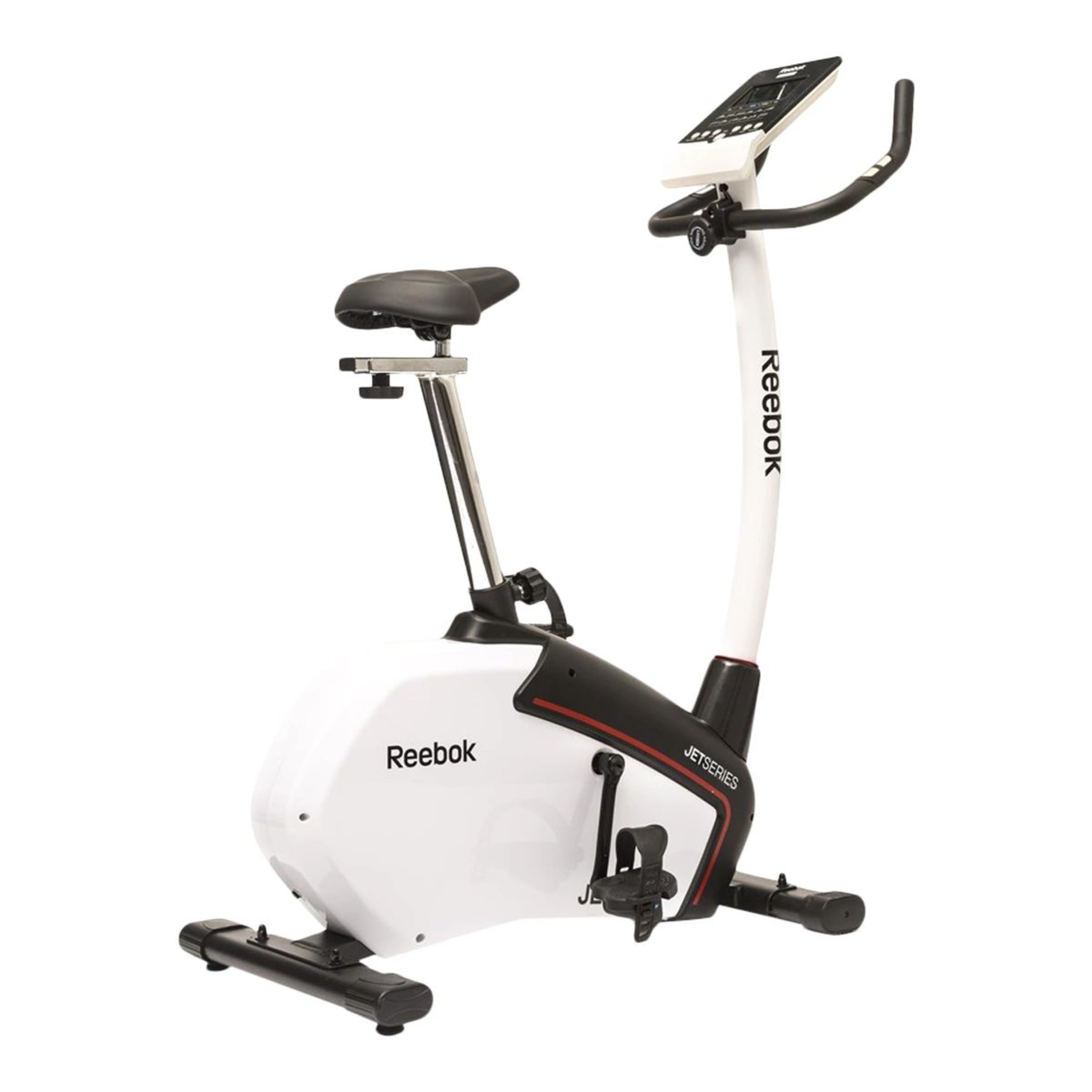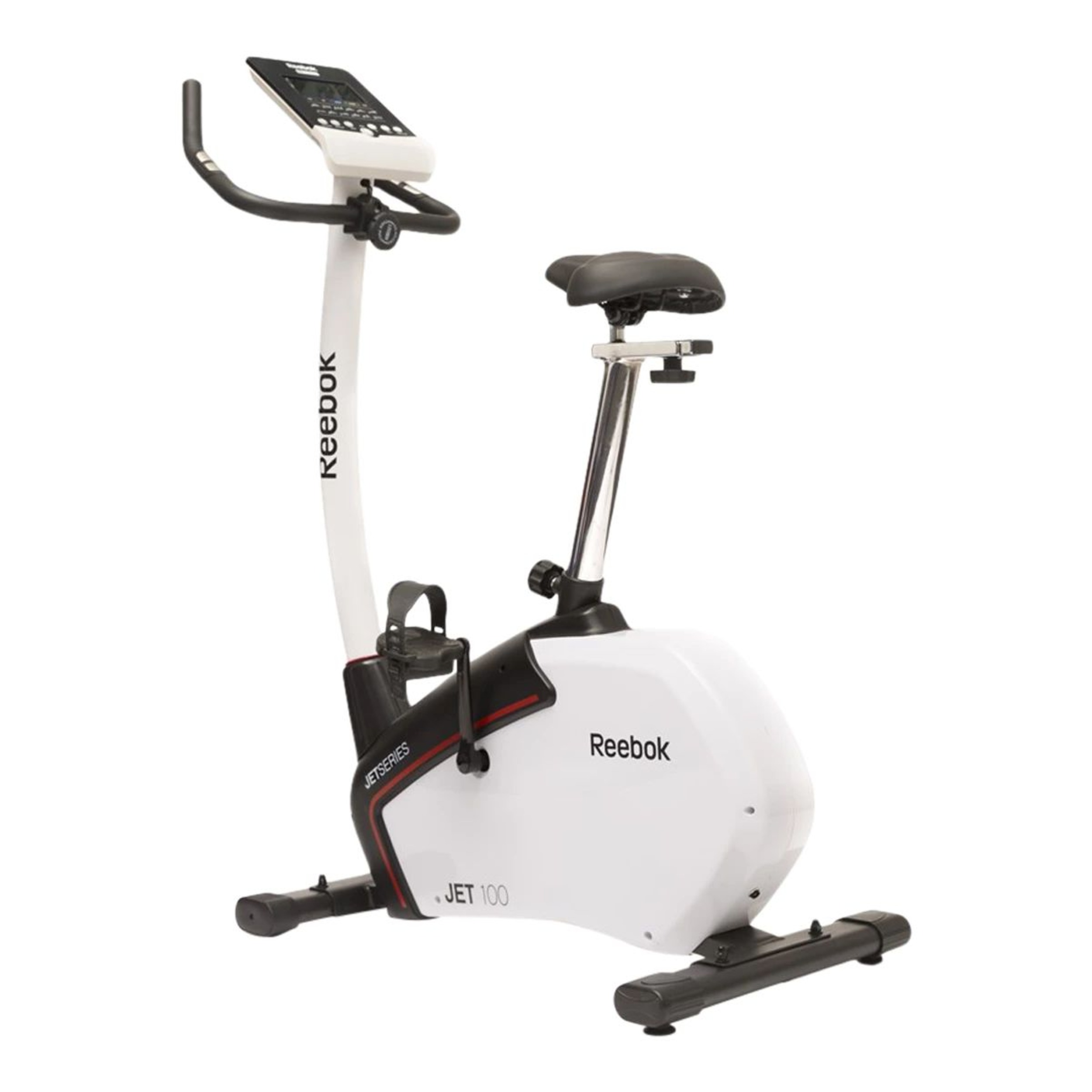 Introducing the Jet 100 Series Bike, a compact and versatile machine for cardio and muscular endurance workouts. It features a robust 9 kg flywheel and 32 levels of electronic resistance. The console offers 12 pre-set workouts, user-defined programs, and real-time performance tracking. With an adjustable saddle and foam-coated handles, it provides comfort and flexibility. The bike includes transport wheels and has a maximum user weight of 120 kg. It comes with Reebok's quality assurance and a warranty for peace of mind.