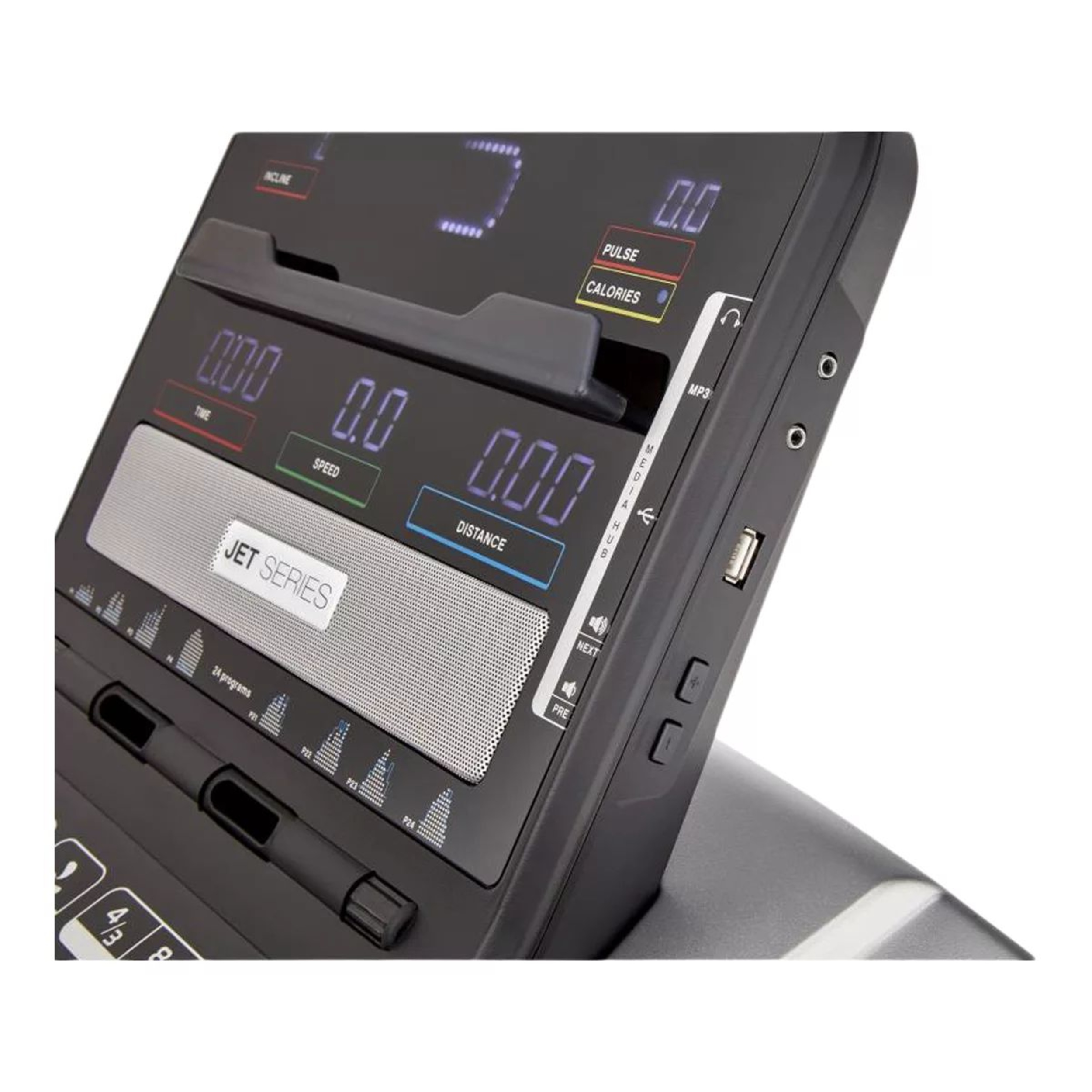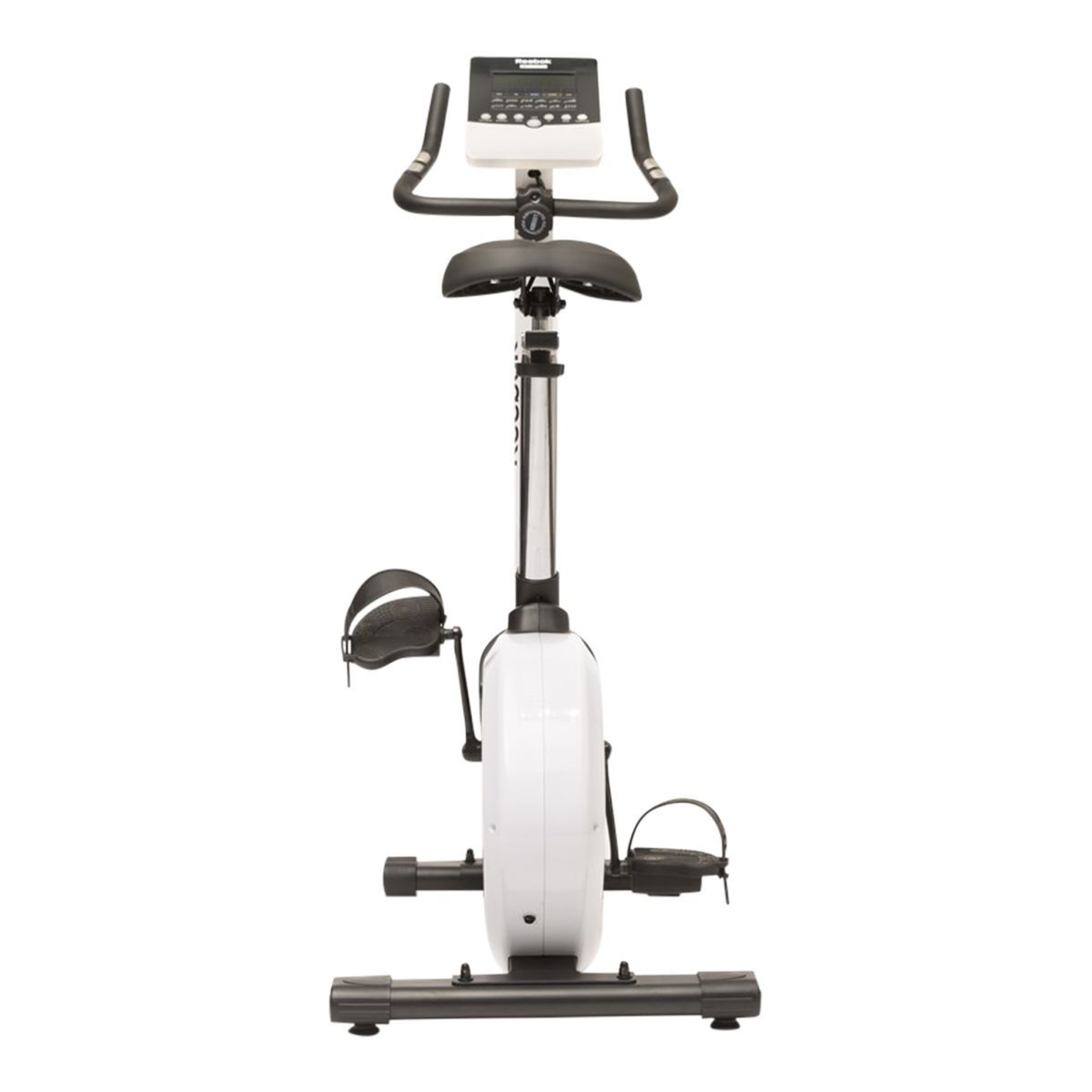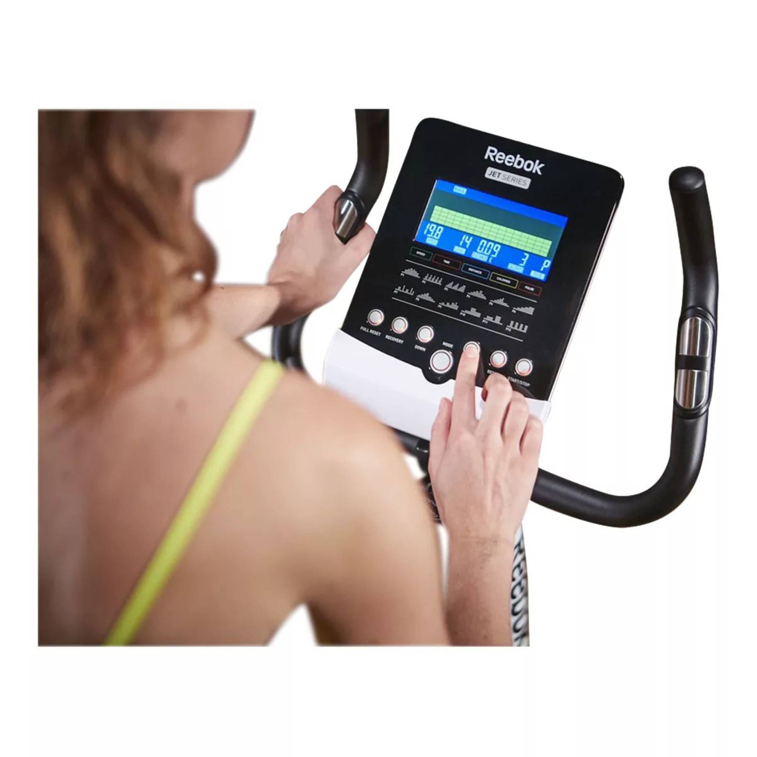 Introducing the Jet 100 Series Bike, a compact and versatile machine for cardio and muscular endurance workouts. It features a robust 9 kg flywheel and 32 levels of electronic resistance. The console offers 12 pre-set workouts, user-defined programs, and real-time performance tracking. With an adjustable saddle and foam-coated handles, it provides comfort and flexibility. The bike includes transport wheels and has a maximum user weight of 120 kg. It comes with Reebok's quality assurance and a warranty for peace of mind.