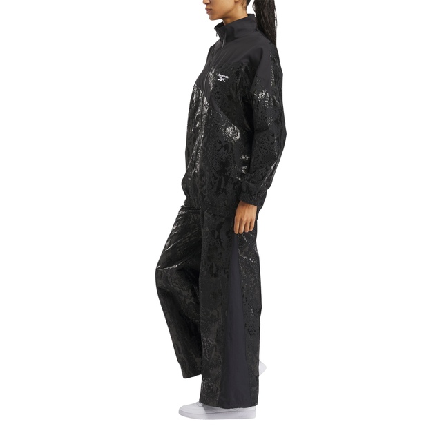 The Reebok Women's Basketball Off-Court Warm Up Jacket adds hoops-inspired style to your wardrobe. Made from lightweight crinkle-woven fabric, it features Vector-inspired cut lines and a snakeskin foil pattern for a bold, eye-catching look. With its oversized fit, this jacket offers a modern silhouette perfect for both the court and the streets.