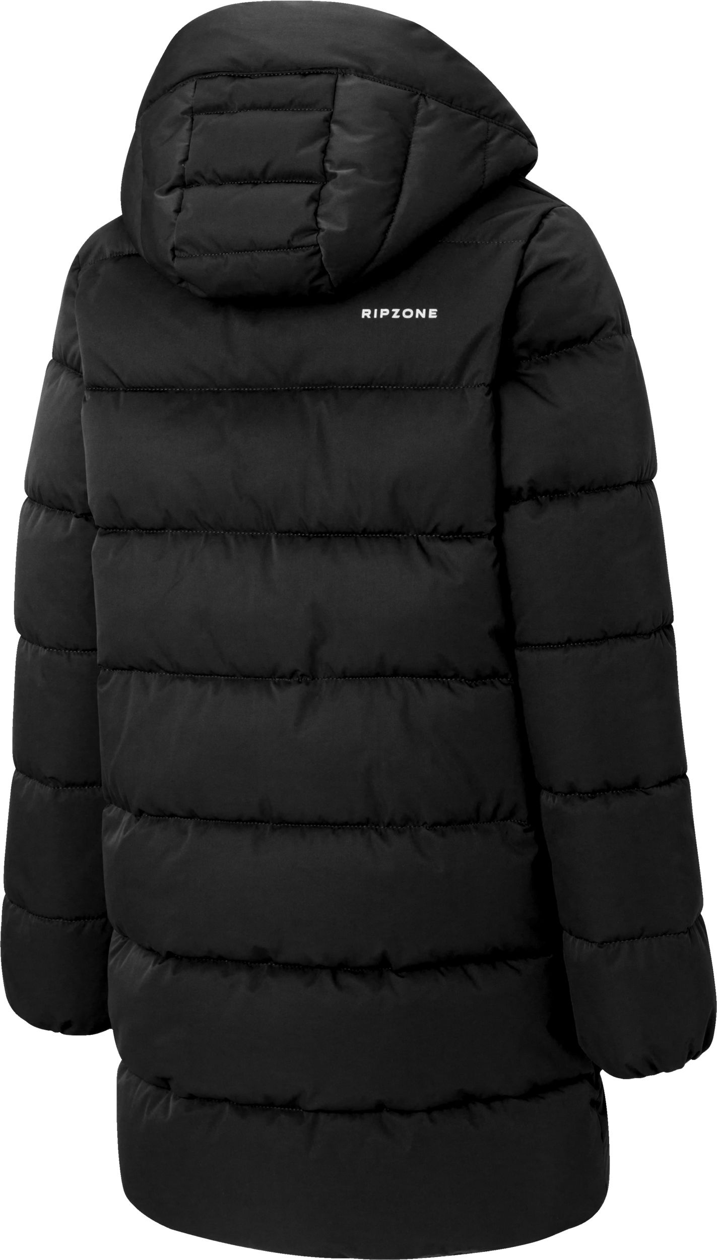 The Ripzone Girls' Saturday Long Puffy Jacket offers a long silhouette for extra coverage and warmth on chilly days. Insulated with down-like Primaloft Thermoplume 100% PCR and treated with a durable water-resistant, this puffy jacket will be ready to take on the winter day in modern style. It includes hand warmer pockets and a fixed hood to keep you covered on outdoor adventures.
